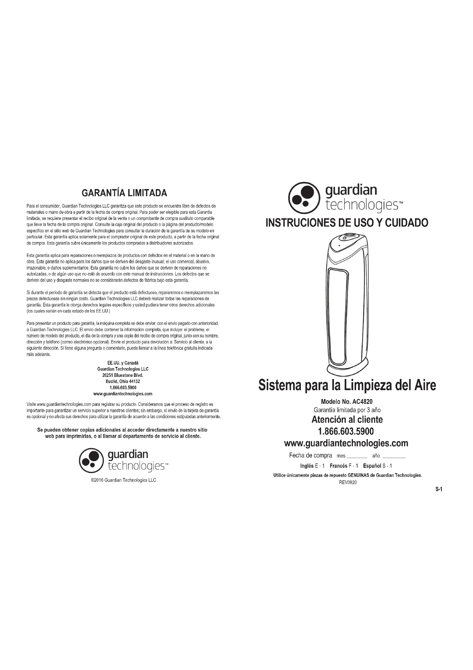 Vérifiez que l’appareil est branché. Vérifiez que le filtre est bien en place. Confirmez que le filtre de rechange est un filtre authentique la clientèle. PROBLÈME L’appareil ne fonctionne pas. SOLUTION L’appareil s’éteint intempestivement. Véri ez que l’appareil est branché à une prise de courant functionnelle. Véri ez que le ltre HEPA est bien en place. Véri ez que le couvercle arrière est bien verrouillé. Veuillez communiquer avec le service à la clientèle. Il n’y pas de circulation d’air. Débranchez l’appareil. Véri ez le pré ltre/ ltre au charbon et le filtre HEPA. Nettoyez le pré ltre/ ltre au charbon au besoin. Remplacez le ltre HEPA au besoin. Augmentation du niveau de bruit. L’indicateur marche/arrêt clignote rouge. Assurez-vous que les ltres sont propres. Remplacez-les au besoin. Remplacez le ltre et réinitialisez le système. Reportez-vous au site Web pour chaque modèle de numéros CADR Débit d’air pur Comparez les performances des différents purificateurs d’air à l’aide du CADR. Premièrement, repérez la superficie de la pièce suggérée. Puis, consultez les données CADR. Plus la valeur est élevée, plus l’appareil filtre rapidement l’air. Qu’est-ce que le CADR? CADR est l’acronyme de Clean Air Delivery Rate, soit le volume d’air filtré produit par unpurificateur d’air. Le classement CADR indique l’efficacité d’un purificateur d’air dans sa filtration des particules fines, telles que la fumée de tabac et les pollens de plantes, dans une pièce.GARANTÍA LIMITADA Se pueden obtener copias adicionales al acceder directamente a nuestro sitio web para imprimirlas, o al llamar al departamento de servicio al cliente.©2016 Guardian Technologies LLCPara el consumidor, Guardian Technologies LLC garantiza que este producto se encuentra libre de defectos de materiales o mano de obra a partir de la fecha de compra original. Para poder ser elegible para esta Garantía limitada, se requiere presentar el recibo original de la venta o un comprobante de compra sustituto comparable que lleve la fecha de la compra original. Consulte la caja original del producto o la página del producto/modelo específico en el sitio web de Guardian Technologies para consultar la duración de la garantía de su modelo en particular. Esta garantía aplica solamente para el comprador original de este producto, a partir de la fecha original de compra. Esta garantía cubre únicamente los productos comprados a distribuidores autorizados.Esta garantía aplica para reparaciones o reemplazos de productos con defectos en el material o en la mano de obra. Esta garantía no aplica para los daños que se deriven del desgaste inusual; el uso comercial, abusivo, irrazonable, o daños suplementarios. Esta garantía no cubre los daños que se deriven de reparaciones no autorizadas, o de algún uso que no esté de acuerdo con este manual de instrucciones. Los defectos que se deriven del uso y desgaste normales no se considerarán defectos de fábrica bajo esta garantía.Si durante el período de garantía se detecta que el producto está defectuoso, repararemos o reemplazaremos las piezas defectuosas sin ningún costo. Guardian Technologies LLC deberá realizar todas las reparaciones de garantía. Esta garantía le otorga derechos legales específicos y usted pudiera tener otros derechos adicionales (los cuales varían en cada estado de los EE.UU.)Para presentar un producto para garantía, la máquina completa se debe enviar, con el envío pagado con anterioridad, a Guardian Technologies LLC. El envío debe contener la información completa, que incluye: el problema, el número de modelo del producto, el día de la compra y una copia del recibo de compra original, junto con su nombre, dirección y teléfono (correo electrónico opcional). Envíe el producto para devolución a: Servicio al cliente, a la siguiente dirección. Si tiene alguna pregunta o comentario, puede llamar a la línea telefónica gratuita indicada más adelante. EE.UU. y CanadáGuardian Technologies LLC26251 Bluestone Blvd.Euclid, Ohio 441321.866.603.5900www.guardiantechnologies.comVisite www.guardiantechnologies.com para registrar su producto. Consideramos que el proceso de registro es importante para garantizar un servicio superior a nuestros clientes; sin embargo, el envío de la tarjeta de garantía es opcional y no afecta sus derechos para utilizar la garantía de acuerdo a las condiciones estipuladas anteriormente. Sistema para la Limpieza del Aire