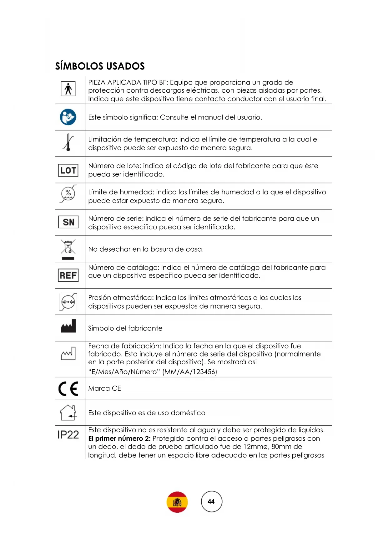 Presión atmosférica: Indica los límites atmosféricos a los cuales los dispositivos pueden ser expuestos de manera segura. Símbolo del fabricante Fecha de fabricación: Indica la fecha en la que el dispositivo fue fabricado. Esta incluye el número de serie del dispositivo (normalmente en la parte posterior del dispositivo). Se mostrará así “E/Mes/Año/Número” (MM/AA/123456) Marca CE Este dispositivo es de uso doméstico