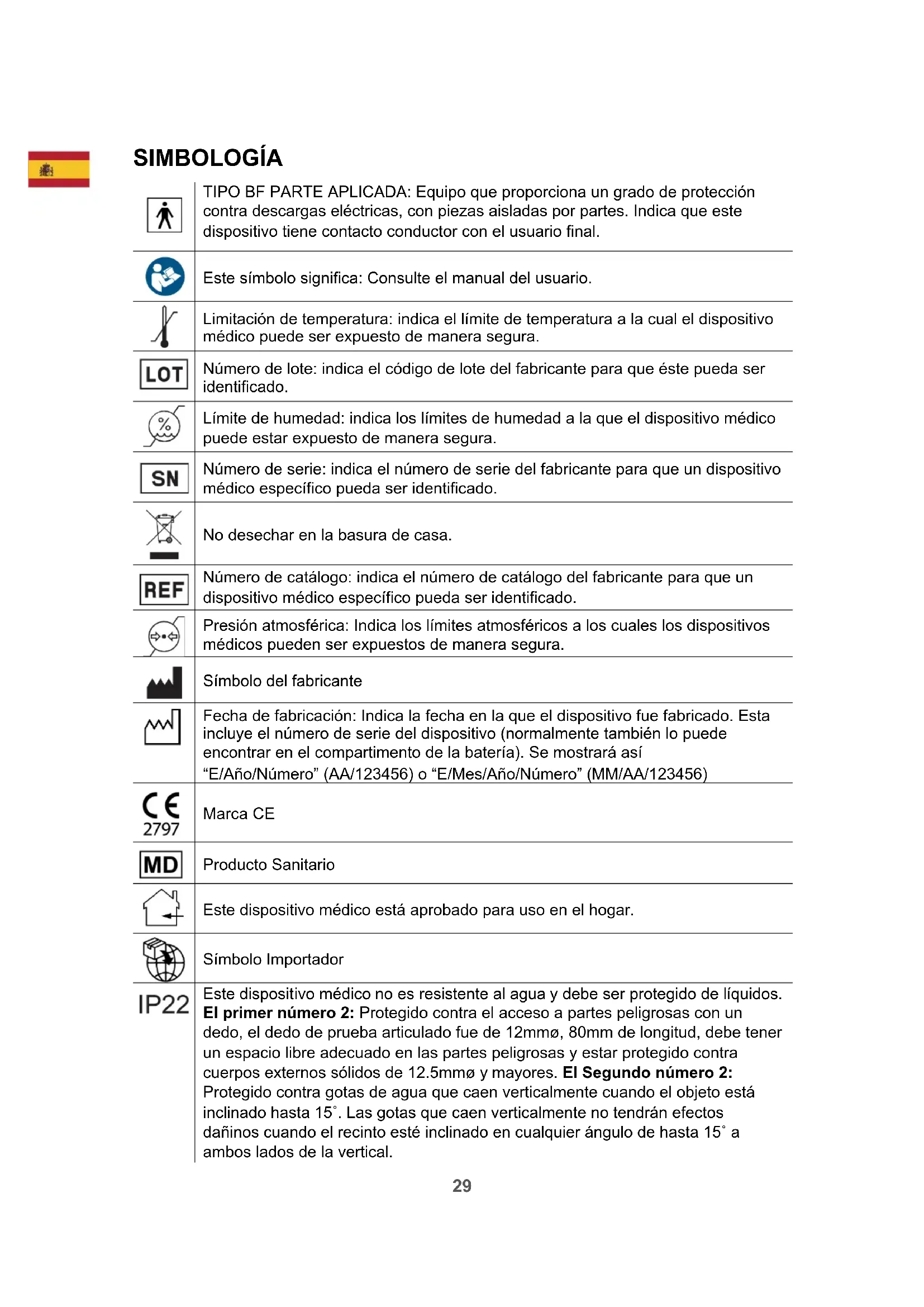 Este dispositivo médico no es resistente al agua y debe ser protegido de líquidos. El primer número 2: Protegido contra el acceso a partes peligrosas con un dedo, el dedo de prueba articulado fue de 12mmø, 80mm de longitud, debe tener un espacio libre adecuado en las partes peligrosas y estar protegido contra cuerpos externos sólidos de 12.5mmø y mayores. El Segundo número 2: Protegido contra gotas de agua que caen verticalmente cuando el objeto está inclinado hasta 15˚. Las gotas que caen verticalmente no tendrán efectos dañinos cuando el recinto esté inclinado en cualquier ángulo de hasta 15˚ a ambos lados de la vertical.30