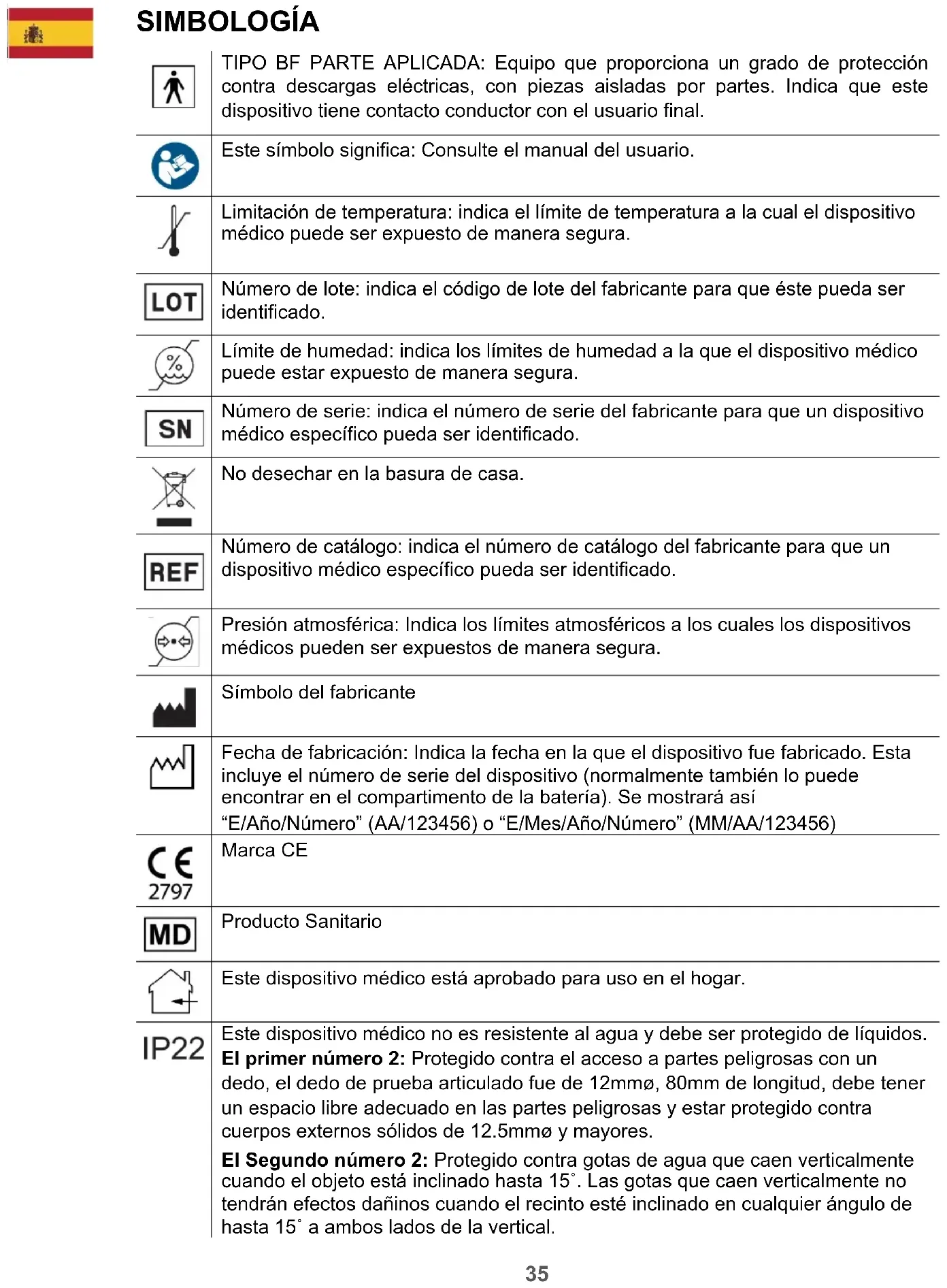 Este dispositivo médico no es resistente al agua y debe ser protegido de líquidos. El primer número 2: Protegido contra el acceso a partes peligrosas con un dedo, el dedo de prueba articulado fue de 12mmø, 80mm de longitud, debe tener un espacio libre adecuado en las partes peligrosas y estar protegido contra cuerpos externos sólidos de 12.5mmø y mayores. El Segundo número 2: Protegido contra gotas de agua que caen verticalmente cuando el objeto está inclinado hasta 15˚. Las gotas que caen verticalmente no tendrán efectos dañinos cuando el recinto esté inclinado en cualquier ángulo de hasta 15˚ a ambos lados de la vertical.36