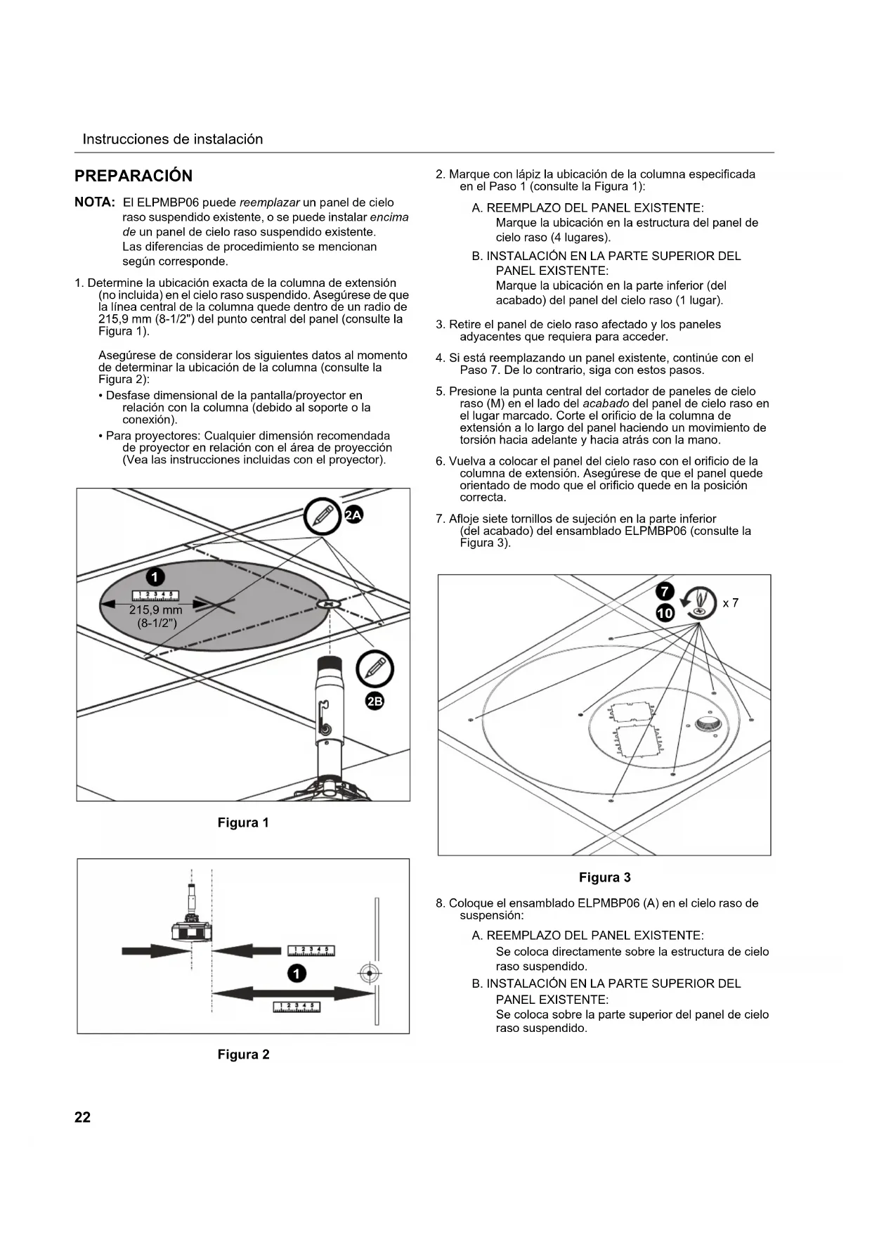 IMPORTANTES ADVERTENCIA: Una ADVERTENCIA alerta al usuario sobre la posibilidad de sufrir lesiones graves o incluso la muerte si no sigue las instrucciones. PRECAUCIÓN: Una PRECAUCIÓN alerta al usuario sobre la posibilidad de que el equipo se dañe o resulte destruido si no sigue las instrucciones. ADVERTENCIA: No leer, comprender completamente y respetar las instrucciones puede causar lesiones graves, ocasionar daños al equipo o dejar sin efecto la garantía del fabricante. Es responsabilidad del instalador asegurarse de que todos los componentes estén correctamente ensamblados e instalados de acuerdo con las instrucciones proporcionadas. ADVERTENCIA: No instalar esta unidad en una estructura lo suficientemente resistente podría causar lesiones graves o daños al equipo. Es responsabilidad del instalador asegurarse de que la estructura en la que se va a montar el componente soporte cinco veces el peso combinado de todo el equipo. Antes de instalar la unidad, refuerce la estructura según sea necesario. ADVERTENCIA: Exceder la capacidad máxima de peso podría causar lesiones graves o daños al equipo. Es responsabilidad del instalador asegurarse de que el peso combinado de todos los equipos que sostendrá el ELPMBP06 no supere los 22 kg (50 libras). ADVERTENCIA: Utilice el soporte únicamente para lo que fue diseñado y de acuerdo con estas instrucciones. No utilice conexiones que no estén recomendadas por el fabricante. ADVERTENCIA: Nunca ponga en funcionamiento el sistema de montaje si está dañado. Llévelo a un centro de servicio técnico para su revisión y reparación. ADVERTENCIA: No utilice este producto al aire libre. ¡IMPORTANTE! El ELPMBP06 puede reemplazar un panel de cielo raso suspendido existente, o se puede instalar encima de un panel de cielo raso suspendido existente. ¡IMPORTANTE! El ELPMBP06 admite un enchufe eléctrico simple, uno doble o ambos. NOTA: Es responsabilidad del instalador asegurase de que la estructura esté fija al piso en la caja de interruptores, de acuerdo con el Código Nacional de Electricidad, ANSI/NFPA 70 o el Código Canadiense de Electricidad, CSA C22.1. NOTA: Es posible utilizar el ELPMBP06 con las columnas ELPMBC02 / ELPMBC03 / ELPMBC04, la placa para cielo raso ELPMBP07 y el soporte para proyector ELPMBPRH.