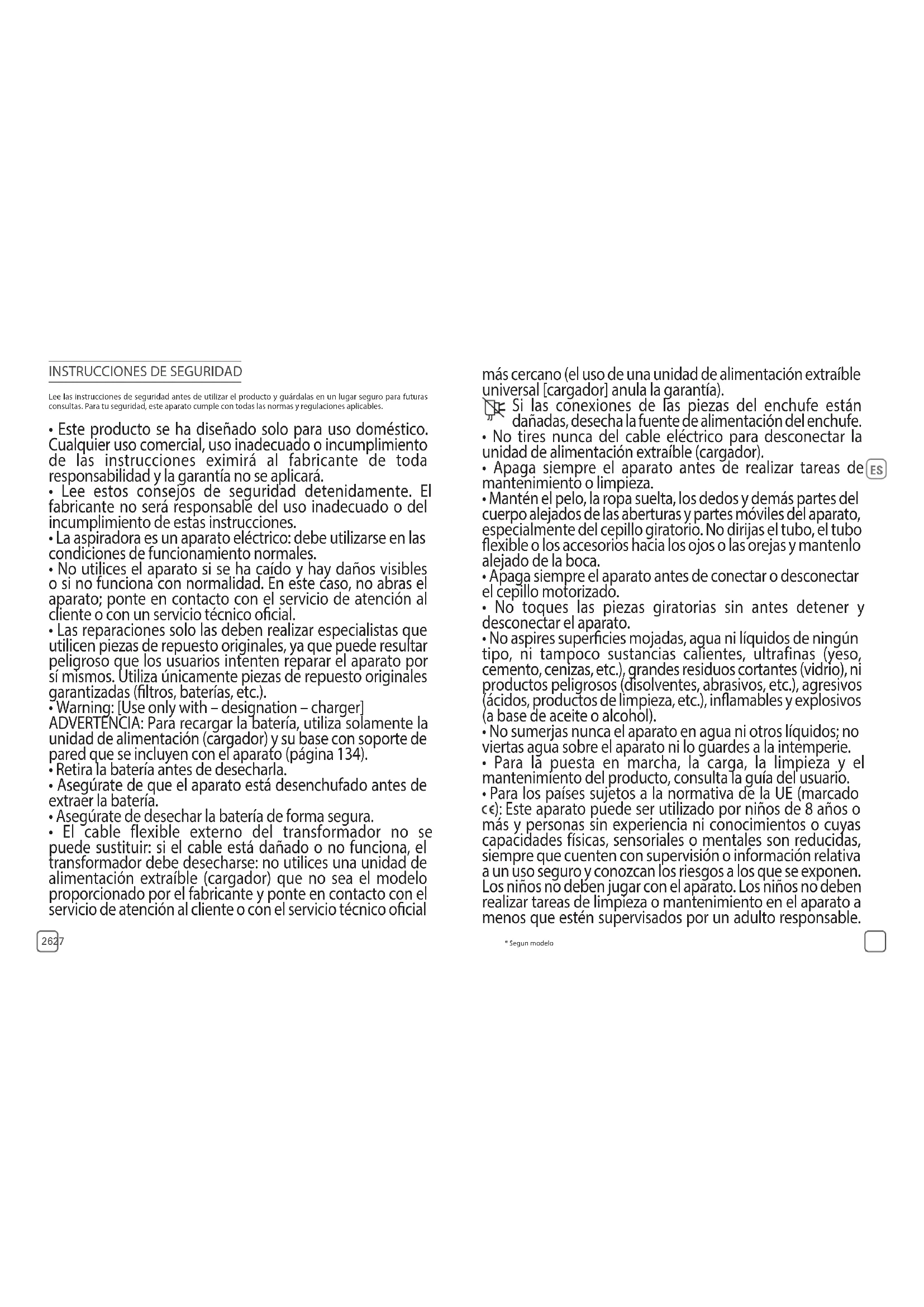 El cargador se calienta. Se trata de un fenómeno totalmente normal. La aspiradora puede estar conectada al cargador constantemente sin riesgos.El cargador está conectado pero el aparato no se carga. El cargador está mal conectado al aparato o está averiado. Comprueba que el cargador está bien conectado o ponte en contacto con el servicio técnico ocial para cambiar el cargador.El aparato se detiene durante el funcionamiento y las luces de carga parpadean muy rápido. El aparato puede haberse recalentado. Apaga el aparato y deja que se enfríe durante 1 hora, por lo menos.La luz de carga parpadea y el aparato se detiene. El aparato ha perdido la carga. Recarga la aspiradora.El cepillo eléctrico no funciona correctamente o hace ruido. El cepillo giratorio o el tubo exible están obstruidos.Detén la aspiradora y límpialos.El cepillo está desgastado.Ponte en contacto con el servicio técnico ocial para cambiar el cepillo.La correa está desgastada.Ponte en contacto con el servicio técnico ocial para cambiar la correa.El cepillo eléctrico se detiene durante el uso de la aspiradora. Se ha encendido el dispositivo de seguridad térmica.Detén la aspiradora. Comprueba que no haya nada que impida la rotación del cepillo; si hay alguna obstrucción, retíralo, limpia el cepillo eléctrico y, a continuación, encienda la aspiradora.La aspiradora no funciona de forma adecuada o emite un silbido. El tubo o el tubo exible están parcialmente obstruidos. Desatáscalos.El compartimento de polvo está lleno. Vacíalo y lávalo.El compartimento de polvo está mal colocado.Vuelve a colocarlo correctamente. El cabezal de aspiración está sucio. Retira el cepillo eléctrico y límpialo.El ltro protector del motor está lleno. Límpialo.La aspiradora está cargada, las luces de carga parpadean en rojo o muy rápidamente.No se está utilizando el cargador correcto o el cargador está defectuoso.Ponte en contacto con un servicio técnico ocial para cambiar el cargador.El LED rojo del producto parpadea durante el usoEl cepillo del cabezal de aspiración está obstruido.Deja de aspirar y comprueba que no haya nada que impida la rotación del cepillo.La temperatura de la batería es demasiado alta.Deja reposar el producto durante 30 minutos. Si el problema persiste, sustituye la batería.Los conectores del tubo o del cabezal de aspiración están sucios o dañados.Limpia el tubo y los conectores del cabezal de aspiración con un paño.El motor de aspiración no funciona.Ponte en contacto con un servicio técnico ocial para reparar el aparato. Conserva este manual de usuario. MEDIOAMBIENTE Conforme a la normativa vigente, los aparatos que hayan nalizado su vida útil deben llevarse a un servicio técnico ocial que se encargará de gestionar su eliminación. Ayudemos a proteger el medio ambiente. Este dispositivo se ha diseñado para durar muchos años. Sin embargo, cuando decidas sustituirlo, piensa en cómo puedes ayudar a proteger el medio ambiente permitiendo que se reutilice, recicle o recupere de alguna otra forma. Los residuos de aparatos eléctricos y electrónicos pueden contener sustancias nocivas que pueden dañar el medio ambiente y la salud humana. Esta etiqueta indica que este producto no debe desecharse con la basura doméstica. Llévalo a un punto de recogida, al distribuidor cuando compres un nuevo producto equivalente o a un centro de servicio autorizado para su procesamiento. Antes de desechar el dispositivo, extrae la batería y deséchala de acuerdo con la legislación local y las normativas locales. Si tienes alguna pregunta, ponte en contacto con el distribuidor del producto para que te indique qué hacer.PT