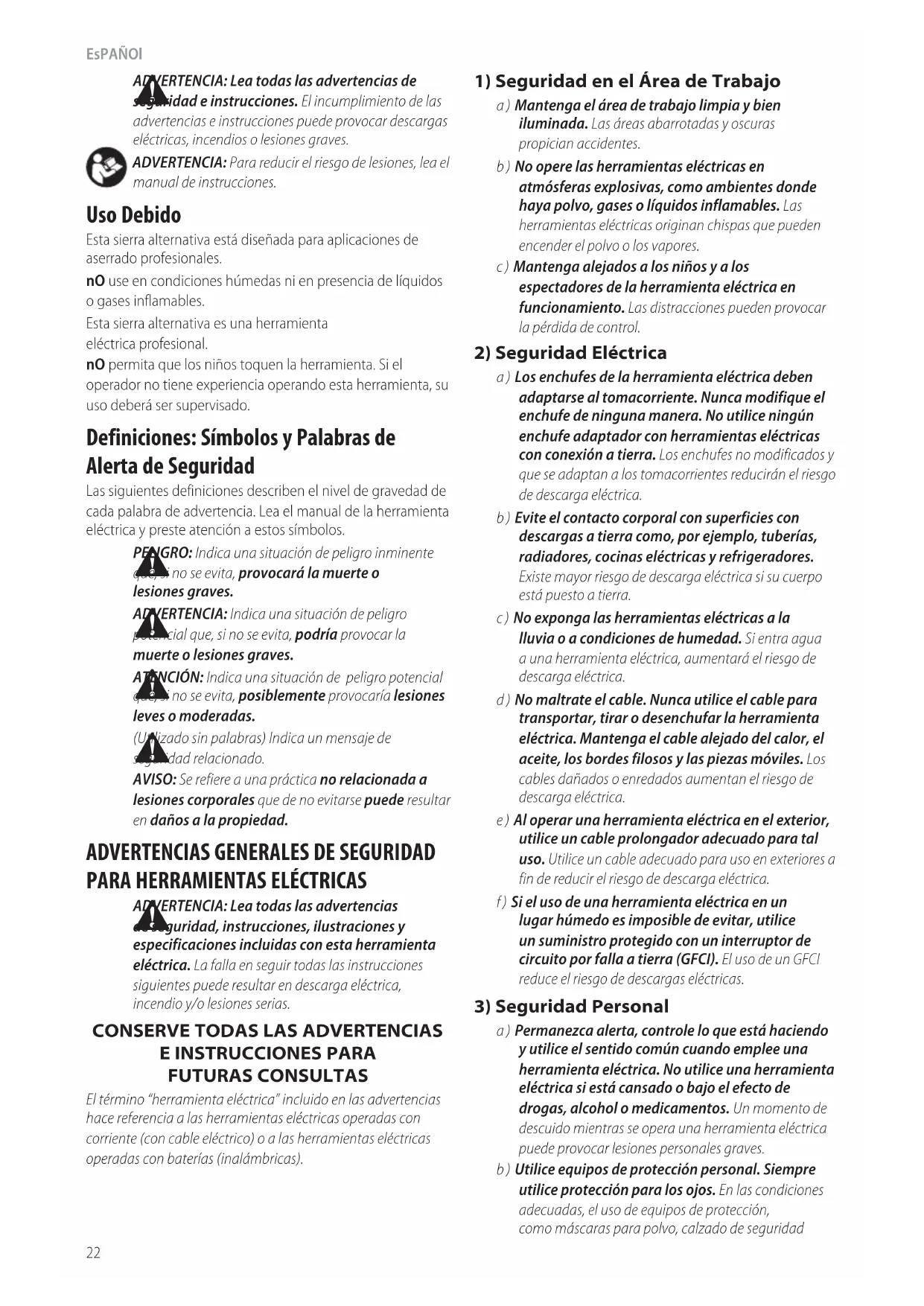 (Utilizado sin palabras) Indica un mensaje de seguridadrelacionado. AVISO: Se refiere a una práctica no relacionada a lesiones corporales que de no evitarse puede resultar en daños a lapropiedad. Uso Debido Esta sierra alternativa está diseñada para aplicaciones de aserradoprofesionales. nO use en condiciones húmedas ni en presencia de líquidos o gasesinflamables. Esta sierra alternativa es una herramienta eléctricaprofesional. nO permita que los niños toquen la herramienta. Si el operador no tiene experiencia operando esta herramienta, su uso deberá sersupervisado. Español (traducido de las instrucciones originales)