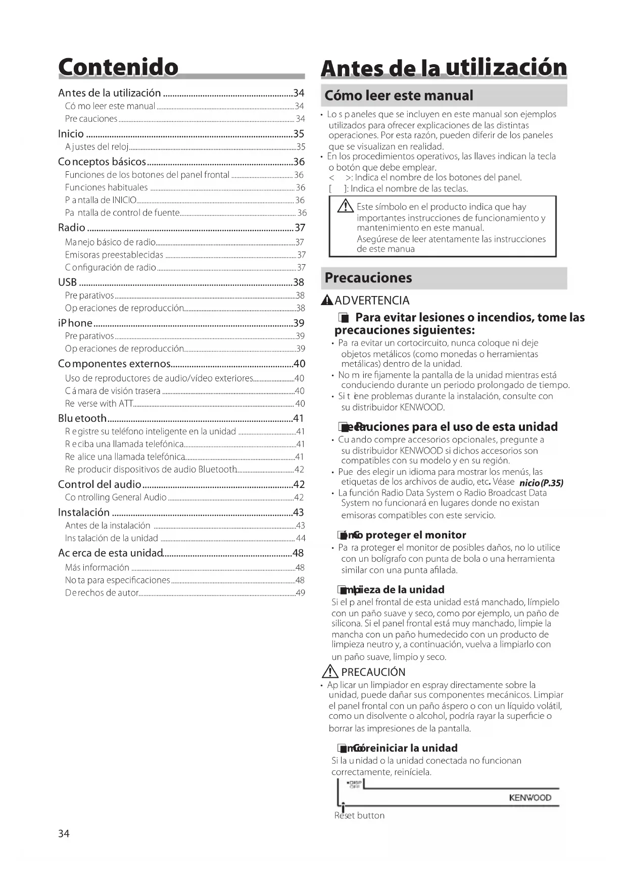Selecciona el modo Reproducción aleatoria.[ ] :Selecciona el modo de reproducción Repetir. [U], [H] : Reproduce o pausa. [E], [F] :Busca el contenido anterior/siguiente.Mantenga pulsado para avanzar o retrocederrápidamente. [1] : Busca el archivo.(P.42)43 Español | Instalación Instalación Antes de la instalación Antes de la instalación de esta unidad, tenga en cuenta las precauciones siguientes. #ADVERTENCIAS