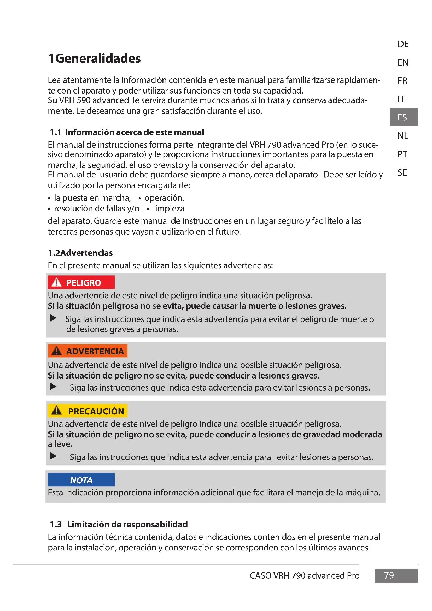 La información técnica contenida, datos e indicaciones contenidos en el presente manual para la instalación, operación y conservación se corresponden con los últimos avances NOTA80 CASO VRH 790 advanced Pro