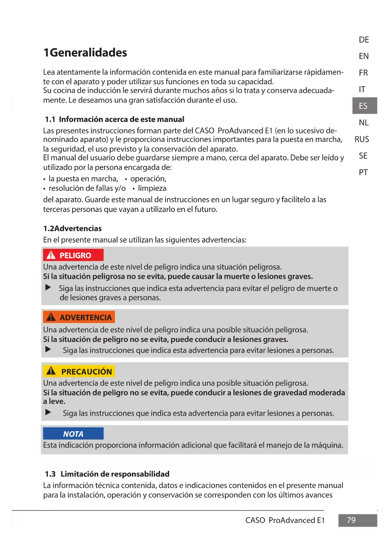 ADVERTENCIA Los alimentos o piezas de vajilla calentados en este aparato, así como la super cie del mismo, pueden calentarse mucho. Tenga presentes las siguientes instrucciones de seguridad para no quemarse o escaldarse usted o a otras personas. No coloque utensilios de cocina, tapaderas de olla o sartén, cuchillas u otros objetos de metal sobre el fogón. Cuando se enciende el aparato, estos aparatos pueden calentarse mucho. No tocar la super cie caliente de la placa.CASO ProAdvanced E1