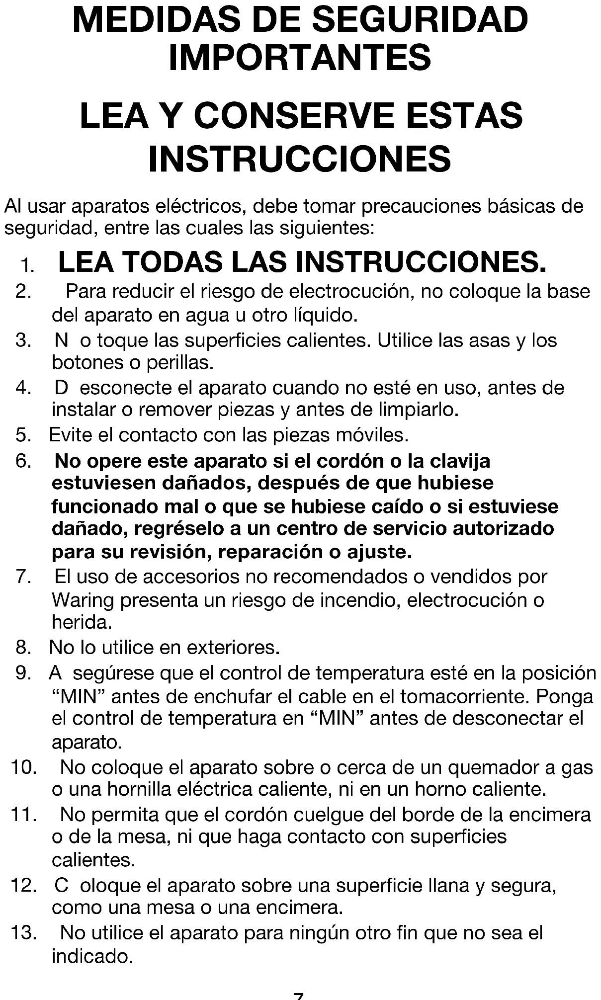 Waring presenta un riesgo de incendio, electrocución o herida.