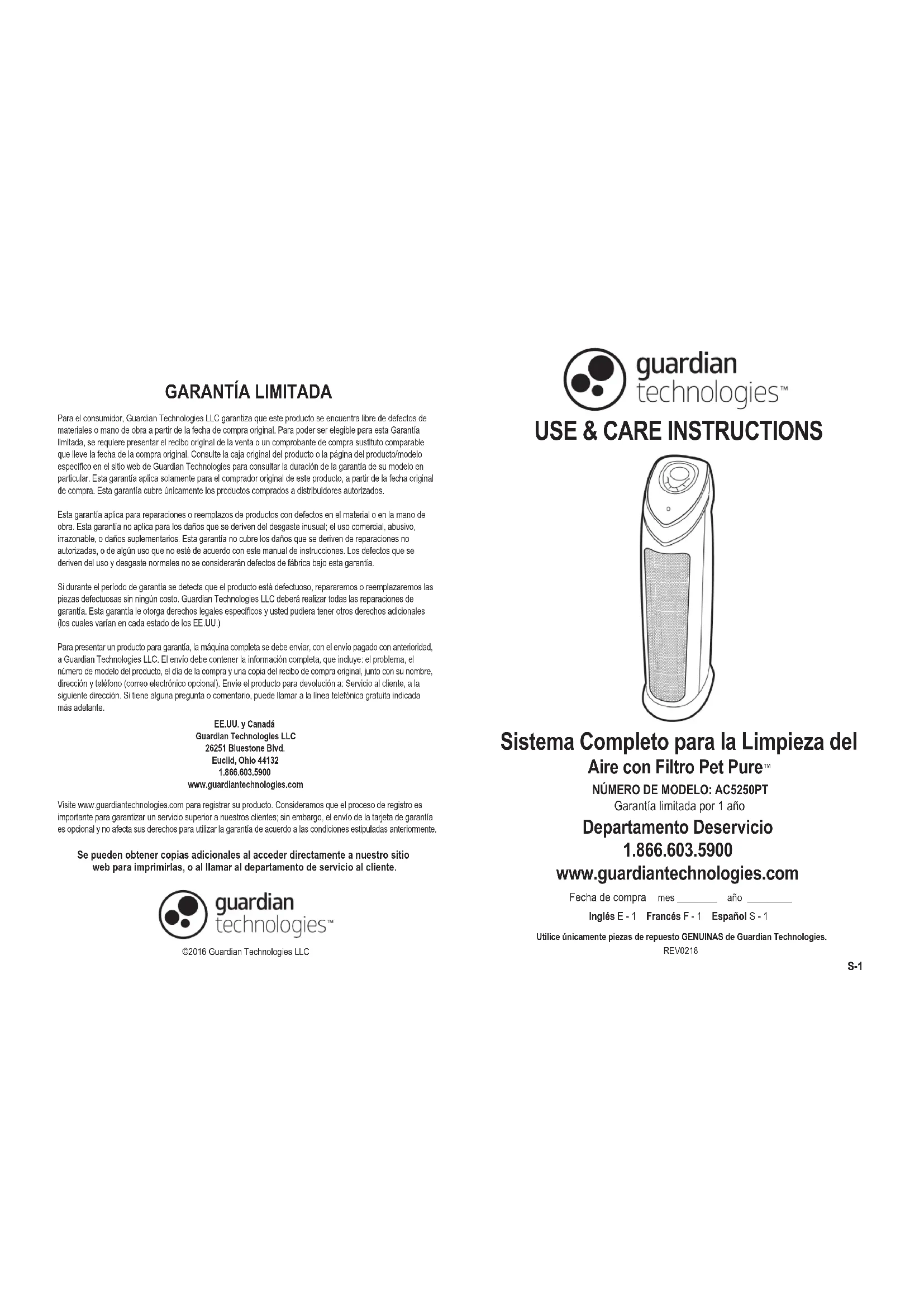 Se pueden obtener copias adicionales al acceder directamente a nuestro sitio web para imprimirlas, o al llamar al departamento de servicio al cliente.©2016 Guardian Technologies LLCPara el consumidor, Guardian Technologies LLC garantiza que este producto se encuentra libre de defectos de materiales o mano de obra a partir de la fecha de compra original. Para poder ser elegible para esta Garantía limitada, se requiere presentar el recibo original de la venta o un comprobante de compra sustituto comparable que lleve la fecha de la compra original. Consulte la caja original del producto o la página del producto/modelo específico en el sitio web de Guardian Technologies para consultar la duración de la garantía de su modelo en particular. Esta garantía aplica solamente para el comprador original de este producto, a partir de la fecha original de compra. Esta garantía cubre únicamente los productos comprados a distribuidores autorizados.Esta garantía aplica para reparaciones o reemplazos de productos con defectos en el material o en la mano de obra. Esta garantía no aplica para los daños que se deriven del desgaste inusual; el uso comercial, abusivo, irrazonable, o daños suplementarios. Esta garantía no cubre los daños que se deriven de reparaciones no autorizadas, o de algún uso que no esté de acuerdo con este manual de instrucciones. Los defectos que se deriven del uso y desgaste normales no se considerarán defectos de fábrica bajo esta garantía.Si durante el período de garantía se detecta que el producto está defectuoso, repararemos o reemplazaremos las piezas defectuosas sin ningún costo. Guardian Technologies LLC deberá realizar todas las reparaciones de garantía. Esta garantía le otorga derechos legales específicos y usted pudiera tener otros derechos adicionales (los cuales varían en cada estado de los EE.UU.)Para presentar un producto para garantía, la máquina completa se debe enviar, con el envío pagado con anterioridad, a Guardian Technologies LLC. El envío debe contener la información completa, que incluye: el problema, el número de modelo del producto, el día de la compra y una copia del recibo de compra original, junto con su nombre, dirección y teléfono (correo electrónico opcional). Envíe el producto para devolución a: Servicio al cliente, a la siguiente dirección. Si tiene alguna pregunta o comentario, puede llamar a la línea telefónica gratuita indicada más adelante.EE.UU. y CanadáGuardian Technologies LLC26251 Bluestone Blvd.Euclid, Ohio 441321.866.603.5900www.guardiantechnologies.comVisite www.guardiantechnologies.com para registrar su producto. Consideramos que el proceso de registro es importante para garantizar un servicio superior a nuestros clientes; sin embargo, el envío de la tarjeta de garantía es opcional y no afecta sus derechos para utilizar la garantía de acuerdo a las condiciones estipuladas anteriormente.S-2