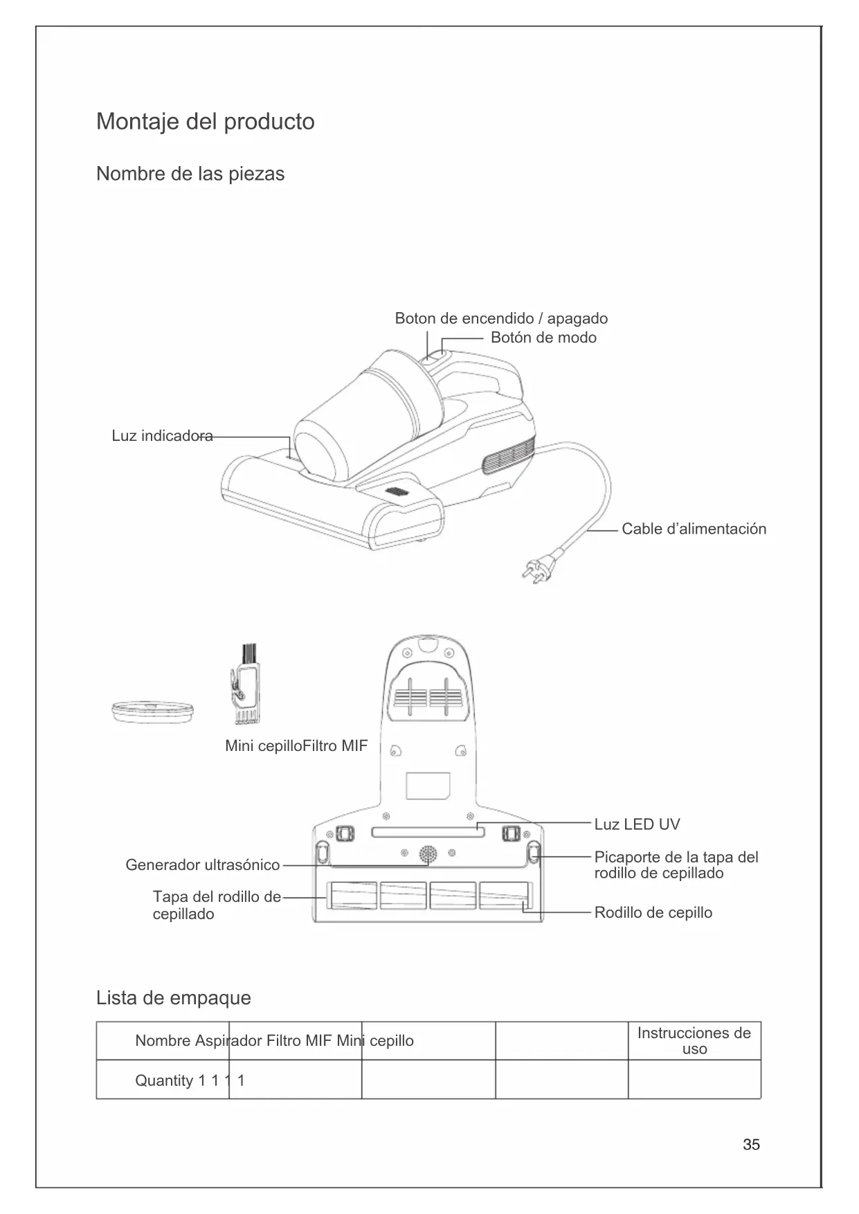 Uso del producto Descripción de funciones Inserte el enchufe en el enchufe, presione el botón de encendido / apagado, la máquina está en modo fuerte y el indicador se iluminará. Presione el botón de modo para cambiar el modo bajo y el indicador bajo se iluminará. Presione el botón de inicio / parada nuevamente, la máquina deja de funcionar. Nota: 1.Cuando el polvo excede la línea Max, por favor limpie el cubo de polvo y el filtro MIF a tiempo. 2.Por razones de seguridad, los rayos ultravioleta solo funcionan cuando se presionan dos microswitch al mismo tiempo. De lo contrario, los rayos ultravioleta se apagarán automáticamente. 3.Este producto está equipado con lámparas ultravioleta. no mire la parte inferior de la máquina, debe iluminar las plantas al encender la fuente de alimentación para evitar que los rayos ultravioleta causen daños al cuerpo humano u otros objetos. Limpieza y mantenimiento Nota: