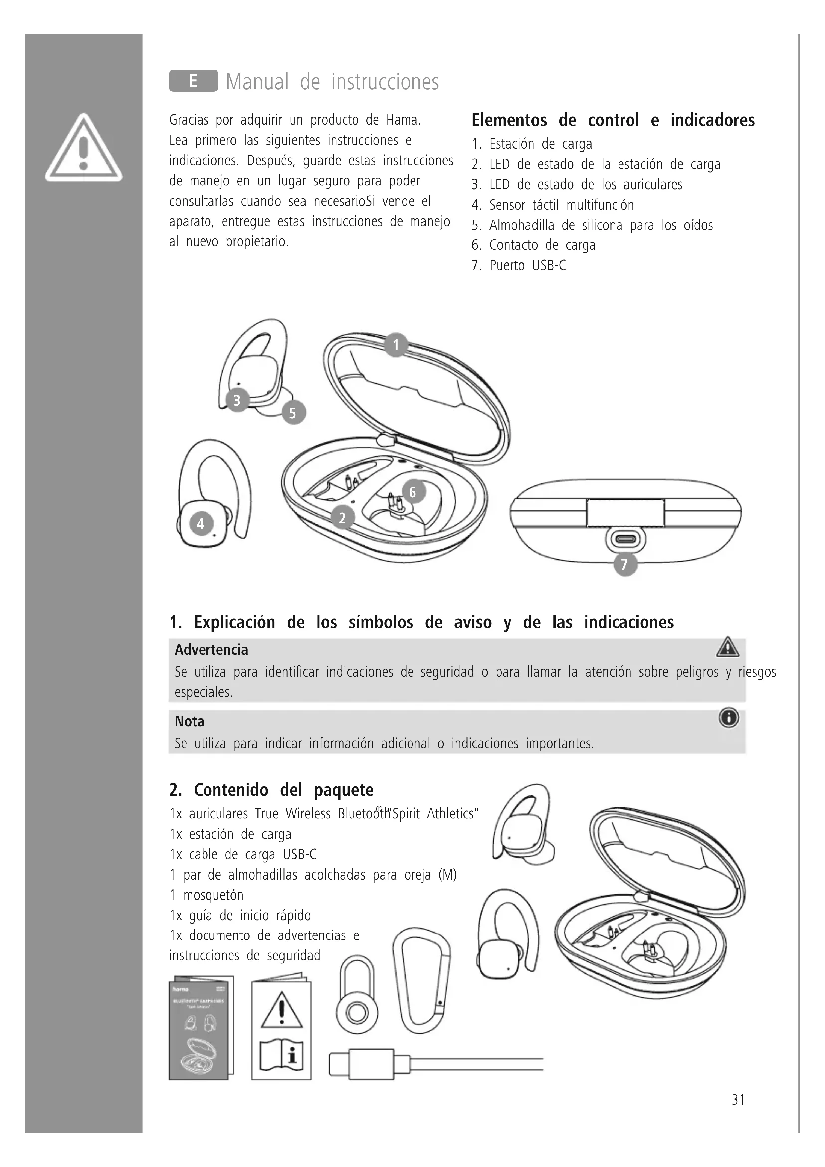 Le soussigné, Hama GmbH & Co KG, déclare que l’équipement radioélectrique du type [00184113, 00184115] est conforme à la directive 2014/53/UE Le texte complet de la déclaration UE de conformité est disponible à l’adresse internet suivante : https://fr.hama.com 00184113, 00184115 Téléchargements Bandes de fréquences 2 402 – 2 480 MHz Puissance d’émission émise maximale 2,5mW EIRP31 Gracias por adquirir un producto de Hama Lea primero las siguientes instrucciones e indicaciones Después, guarde estas instrucciones de manejo en un lugar seguro para poder consultarlas cuando sea necesario Si vende el aparato, entregue estas instrucciones de manejo al nuevo propietario Elementos de control e indicadores 1 Estación de carga 2 LED de estado de la estación de carga 3 LED de estado de los auriculares