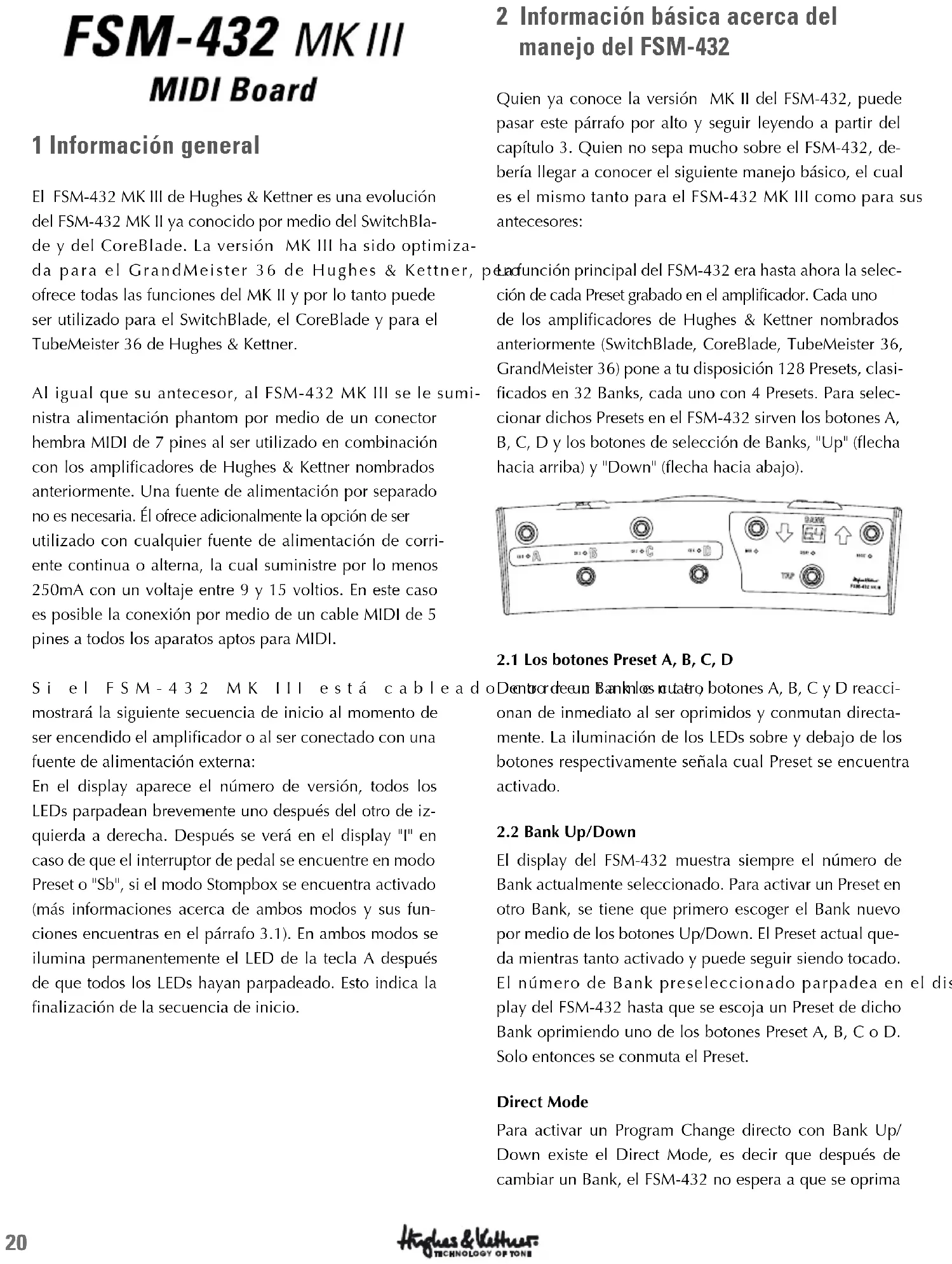 中文20 1 Información general El FSM-432 MK III de Hughes & Kettner es una evolución del FSM-432 MK II ya conocido por medio del SwitchBla- de y del CoreBlade. La versión MK III ha sido optimiza- da para el GrandMeister 36 de Hughes & Kettner, pero ofrece todas las funciones del MK II y por lo tanto puede ser utilizado para el SwitchBlade, el CoreBlade y para el TubeMeister 36 de Hughes & Kettner. Al igual que su antecesor, al FSM-432 MK III se le sumi- nistra alimentación phantom por medio de un conector hembra MIDI de 7 pines al ser utilizado en combinación con los amplificadores de Hughes & Kettner nombrados anteriormente. Una fuente de alimentación por separado no es necesaria. Él ofrece adicionalmente la opción de ser utilizado con cualquier fuente de alimentación de corri- ente continua o alterna, la cual suministre por lo menos 250mA con un voltaje entre 9 y 15 voltios. En este caso es posible la conexión por medio de un cable MIDI de 5 pines a todos los aparatos aptos para MIDI. Si el FSM-432 MK III está cableado correctamente, mostrará la siguiente secuencia de inicio al momento de ser encendido el amplificador o al ser conectado con una fuente de alimentación externa: En el display aparece el número de versión, todos los LEDs parpadean brevemente uno después del otro de iz- quierda a derecha. Después se verá en el display "I" en caso de que el interruptor de pedal se encuentre en modo Preset o "Sb", si el modo Stompbox se encuentra activado (más informaciones acerca de ambos modos y sus fun- ciones encuentras en el párrafo 3.1). En ambos modos se ilumina permanentemente el LED de la tecla A después de que todos los LEDs hayan parpadeado. Esto indica la finalización de la secuencia de inicio. 2 Información básica acerca del manejo del FSM-432 Quien ya conoce la versión MK II del FSM-432, puede pasar este párrafo por alto y seguir leyendo a partir del capítulo 3. Quien no sepa mucho sobre el FSM-432, de- bería llegar a conocer el siguiente manejo básico, el cual es el mismo tanto para el FSM-432 MK III como para sus antecesores: La función principal del FSM-432 era hasta ahora la selec- ción de cada Preset grabado en el amplificador. Cada uno de los amplificadores de Hughes & Kettner nombrados anteriormente (SwitchBlade, CoreBlade, TubeMeister 36, GrandMeister 36) pone a tu disposición 128 Presets, clasi- ficados en 32 Banks, cada uno con 4 Presets. Para selec- cionar dichos Presets en el FSM-432 sirven los botones A, B, C, D y los botones de selección de Banks, "Up" (flecha hacia arriba) y "Down" (flecha hacia abajo).