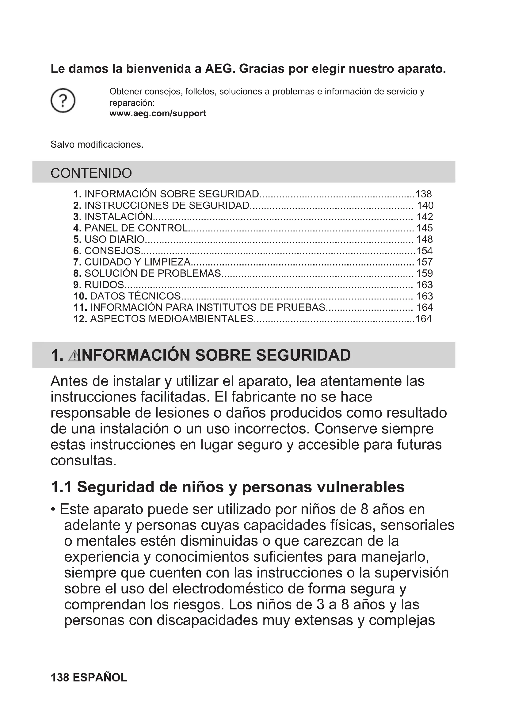 - Este aparato puede ser utilizado por niños de 8 años en adelante y personas cuyas capacidades físicas, sensoriales o mentales estén disminuidas o que carezcan de la experiencia y conocimientos suficientes para manejarlo, siempre que cuenten con las instrucciones o la supervisión sobre el uso del electrodoméstico de forma segura y comprendan los riesgos. Los niños de 3 a 8 años y las personas con discapacidades muy extensas y complejas 138 ESPAÑOLpueden cargar y descargar el aparato siempre que hayan sido debidamente instruidos. Es necesario mantener alejados del aparato a los niños de menos de 3 años salvo que estén bajo supervisión continua.
