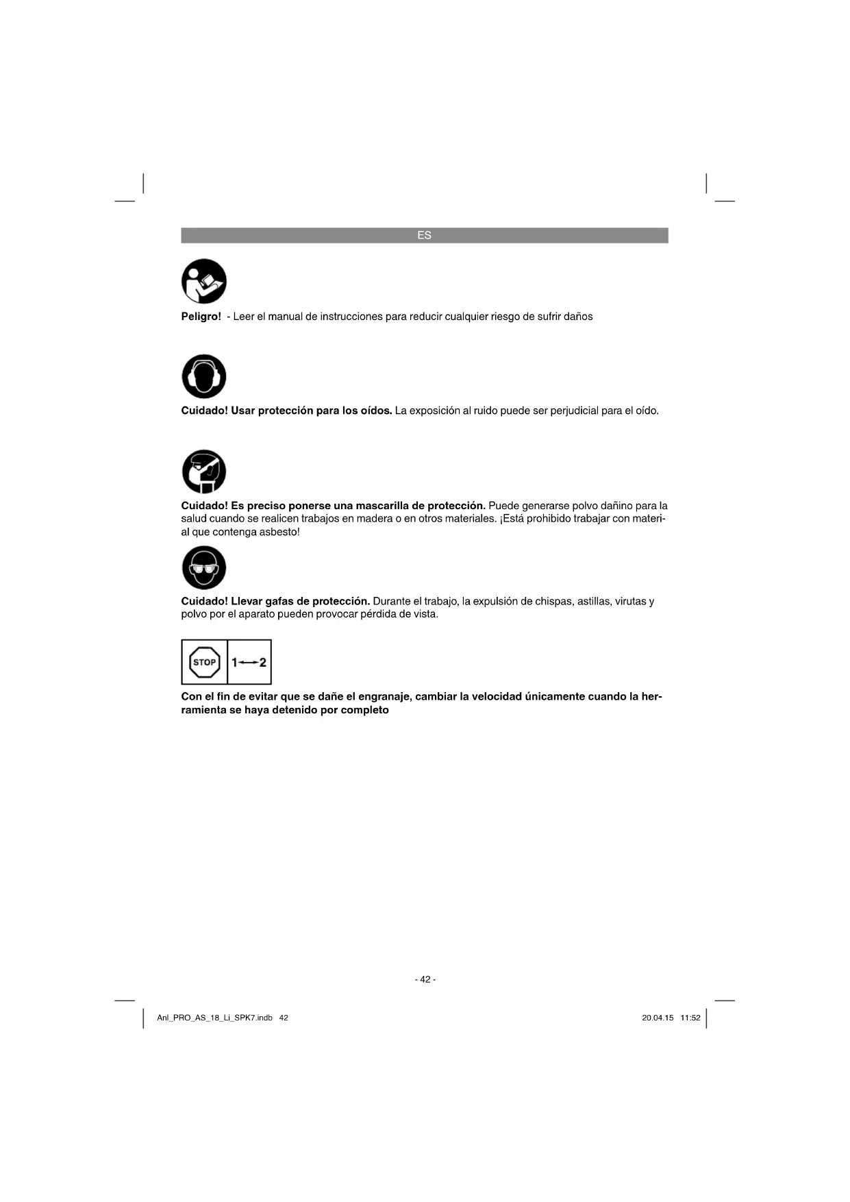 Peligro! - Leer el manual de instrucciones para reducir cualquier riesgo de sufrir daños Cuidado! Usar protección para los oídos. La exposición al ruido puede ser perjudicial para el oído. Cuidado! Llevar gafas de protección. Durante el trabajo, la expulsión de chispas, astillas, virutas y polvo por el aparato pueden provocar pérdida de vista. Cuidado! Es preciso ponerse una mascarilla de protección. Puede generarse polvo dañino para la salud cuando se realicen trabajos en madera o en otros materiales. ¡Está prohibido trabajar con materi- al que contenga asbesto! Con el fi n de evitar que se dañe el engranaje, cambiar la velocidad únicamente cuando la her- ramienta se haya detenido por completo Anl_PRO_AS_18_Li_SPK7.indb 42Anl_PRO_AS_18_Li_SPK7.indb 42 20.04.15 11:5220.04.15 11:52ES