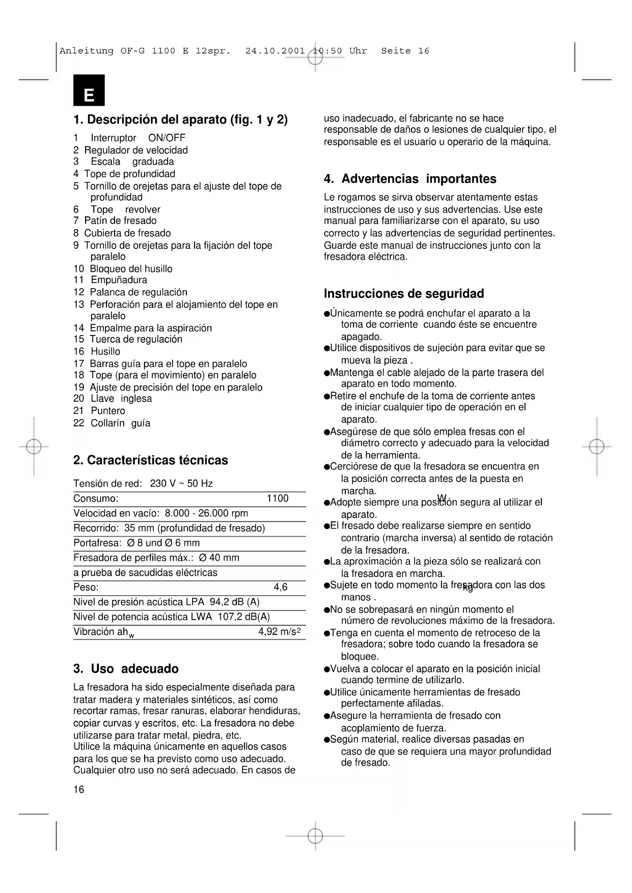 Anleitung OF-G 1100 E 12spr. 24.10.2001 10:50 Uhr Seite 151. Descripción del aparato (fig. 1 y 2) 1 Interruptor ON/OFF 2 Regulador de velocidad 3 Escala graduada 4 Tope de profundidad 5 Tornillo de orejetas para el ajuste del tope de profundidad 6 Tope revolver 7 Patín de fresado 8 Cubierta de fresado 9 Tornillo de orejetas para la fijación del tope paralelo 10 Bloqueo del husillo 11 Empuñadura 12 Palanca de regulación 13 Perforación para el alojamiento del tope en paralelo 14 Empalme para la aspiración 15 Tuerca de regulación 16 Husillo 17 Barras guía para el tope en paralelo 18 Tope (para el movimiento) en paralelo 19 Ajuste de precisión del tope en paralelo 20 Llave inglesa 21 Puntero 22 Collarín guía