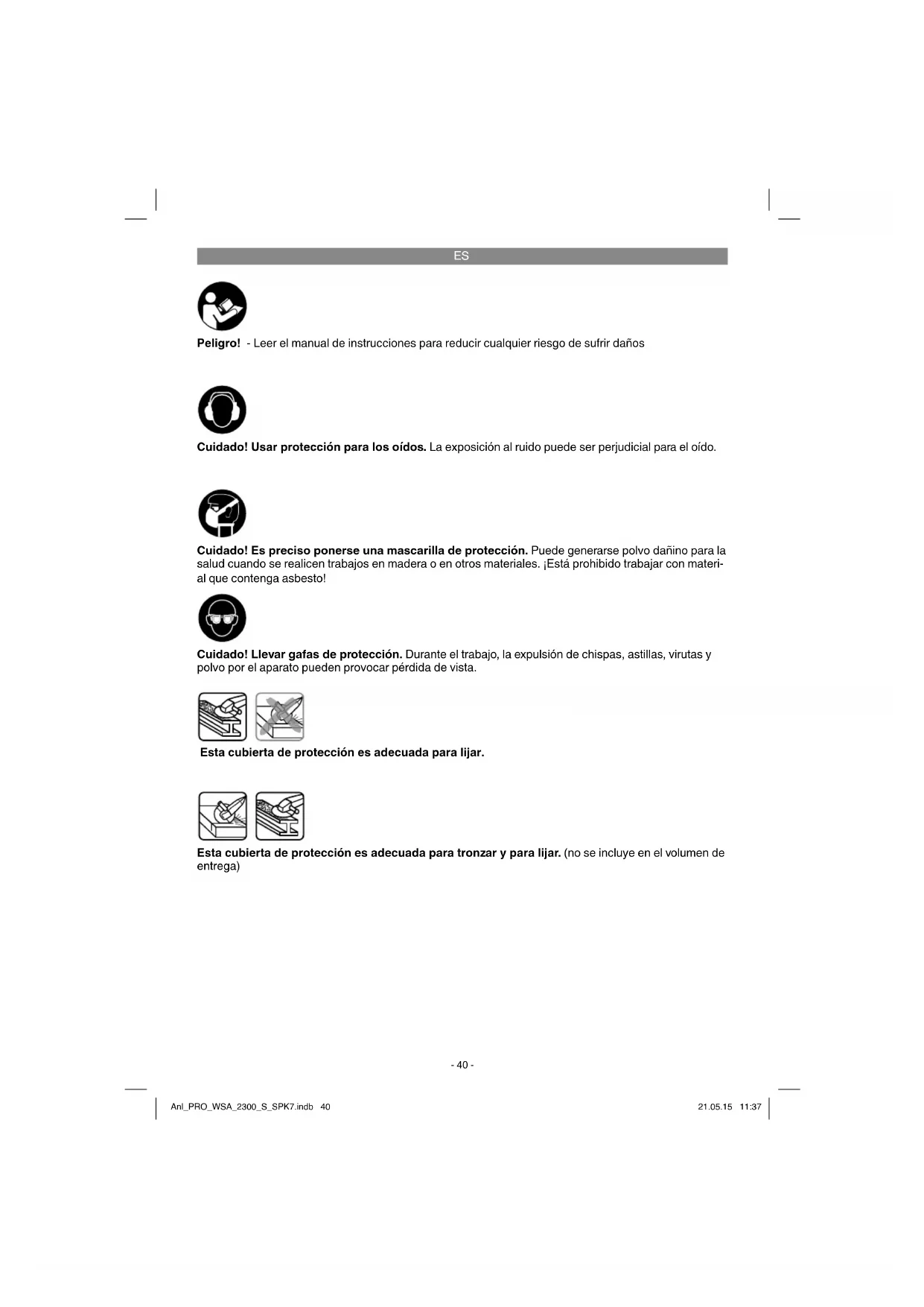 Peligro! - Leer el manual de instrucciones para reducir cualquier riesgo de sufrir daños Cuidado! Usar protección para los oídos. La exposición al ruido puede ser perjudicial para el oído. Cuidado! Llevar gafas de protección. Durante el trabajo, la expulsión de chispas, astillas, virutas y polvo por el aparato pueden provocar pérdida de vista. Cuidado! Es preciso ponerse una mascarilla de protección. Puede generarse polvo dañino para la salud cuando se realicen trabajos en madera o en otros materiales. ¡Está prohibido trabajar con materi- al que contenga asbesto! Esta cubierta de protección es adecuada para tronzar y para lijar. (no se incluye en el volumen de entrega) Esta cubierta de protección es adecuada para lijar. Anl_PRO_WSA_2300_S_SPK7.indb 40Anl_PRO_WSA_2300_S_SPK7.indb 40 21.05.15 11:3721.05.15 11:37ES