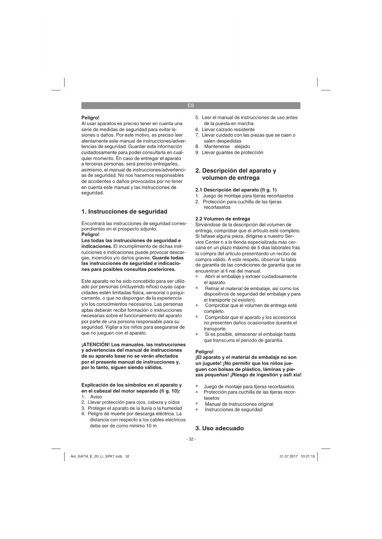 Sólo para países miembros de la UE No tirar herramientas eléctricas en la basura casera. Según la directiva europea 2012/19/CE sobre aparatos usados electrónicos y eléctricos y su aplicación en el derecho nacional, dichos aparatos deberán recojerse por separado y eliminarse de modo ecológi- co para facilitar su posterior reciclaje. Alternativa de reciclaje en caso de devolución: El propietario del aparato eléctrico, en caso de no optar por su devolución, está obligado a reciclar ade- cuadamente dicho aparato eléctrico. Para ello, también se puede entregar el aparato usado a un centro de reciclaje que trate la eliminación de residuos respetando la legislación nacional sobre residuos y su reciclaje. Esto no afecta a los medios auxiliares ni a los accesorios sin componentes eléctricos que acompañan a los aparatos usados. Sólo está permitido copiar la documentación y documentos anexos del producto, o extractos de los mismos, con autorización expresa de iSC GmbH. Nos reservamos el derecho a realizar modifi caciones técnicas Anl_GATH_E_20_Li_SPK7.indb 36Anl_GATH_E_20_Li_SPK7.indb 36 31.07.2017 10:21:1631.07.2017 10:21:16ES