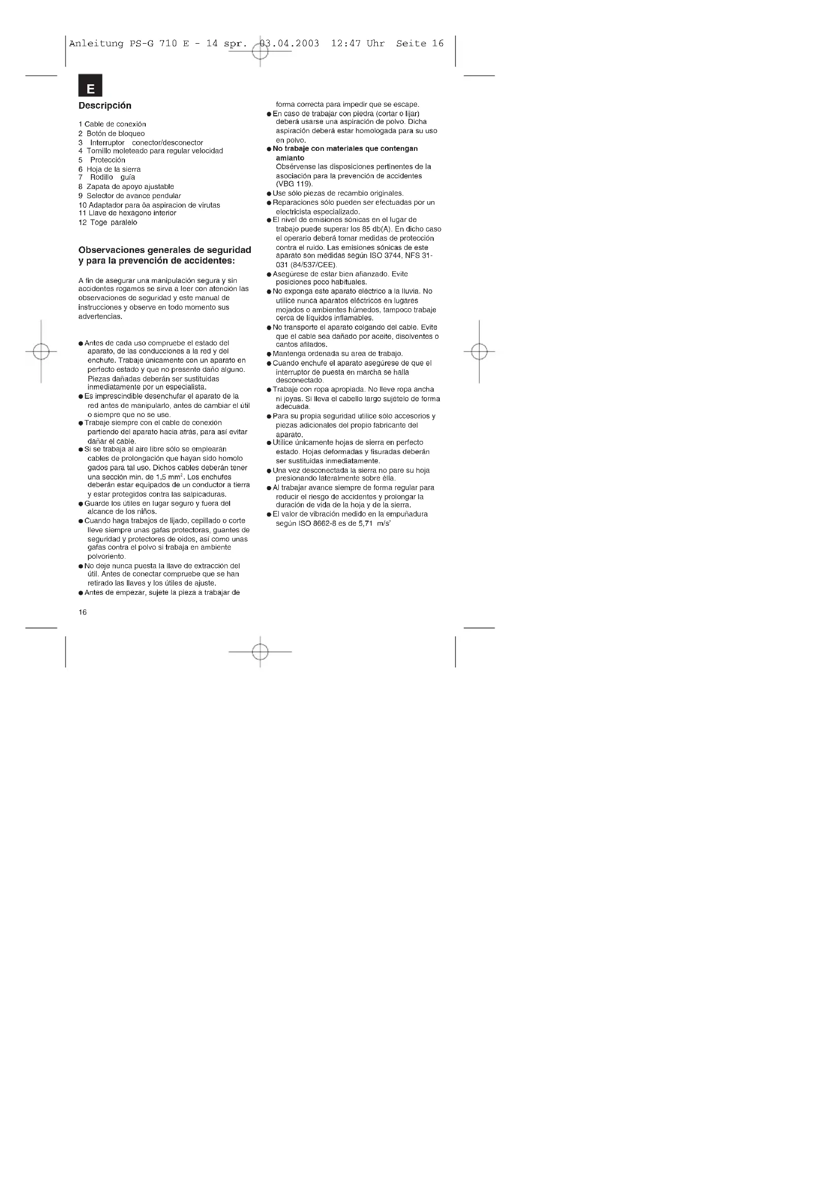 Switching on: Press the On/Off switchContinuous operation: Lock the On/Off switch with the locking buttonSwitching off: Press the On/Off switchand releasein/uitschakelaarvergrendel-Door draaien van de toerentalregelaarwordt het aantal slagen verhoogdDoor losdraaien van de twee schroeven kan de zaag-schoen naar links en rechts of schuin tot max. 45 °versteld worden. Afstelling pendelslag Anleitung PS-G 710 E - 14 spr. 03.04.2003 12:47 Uhr Seite 1516 Descripción 1 Cable de conexión 2 Botón de bloqueo 3 Interruptor conector/desconector 4 Tornillo moleteado para regular velocidad 5 Protección 6 Hoja de la sierra 7 Rodillo guía 8 Zapata de apoyo ajustable 9 Selector de avance pendular 10 Adaptador para öa aspiracion de virutas 11 Llave de hexágono interior 12 Toge paralelo Observaciones generales de seguridad y para la prevención de accidentes: A fin de asegurar una manipulación segura y sin accidentes rogamos se sirva a leer con atención las observaciones de seguridad y este manual de instrucciones y observe en todo momento sus advertencias. Antes de cada uso compruebe el estado del aparato, de las conducciones a la red y del enchufe. Trabaje únicamente con un aparato en perfecto estado y que no presente daño alguno. Piezas dañadas deberán ser sustituidas inmediatamente por un especialista. Es imprescindible desenchufar el aparato de la red antes de manipularlo, antes de cambiar el útil o siempre que no se use. Trabaje siempre con el cable de conexión partiendo del aparato hacia atrás, para así evitar dañar el cable. Si se trabaja al aire libre sólo se emplearán cables de prolongación que hayan sido homolo gados para tal uso. Dichos cables deberán tener una sección min. de 1,5 mm
