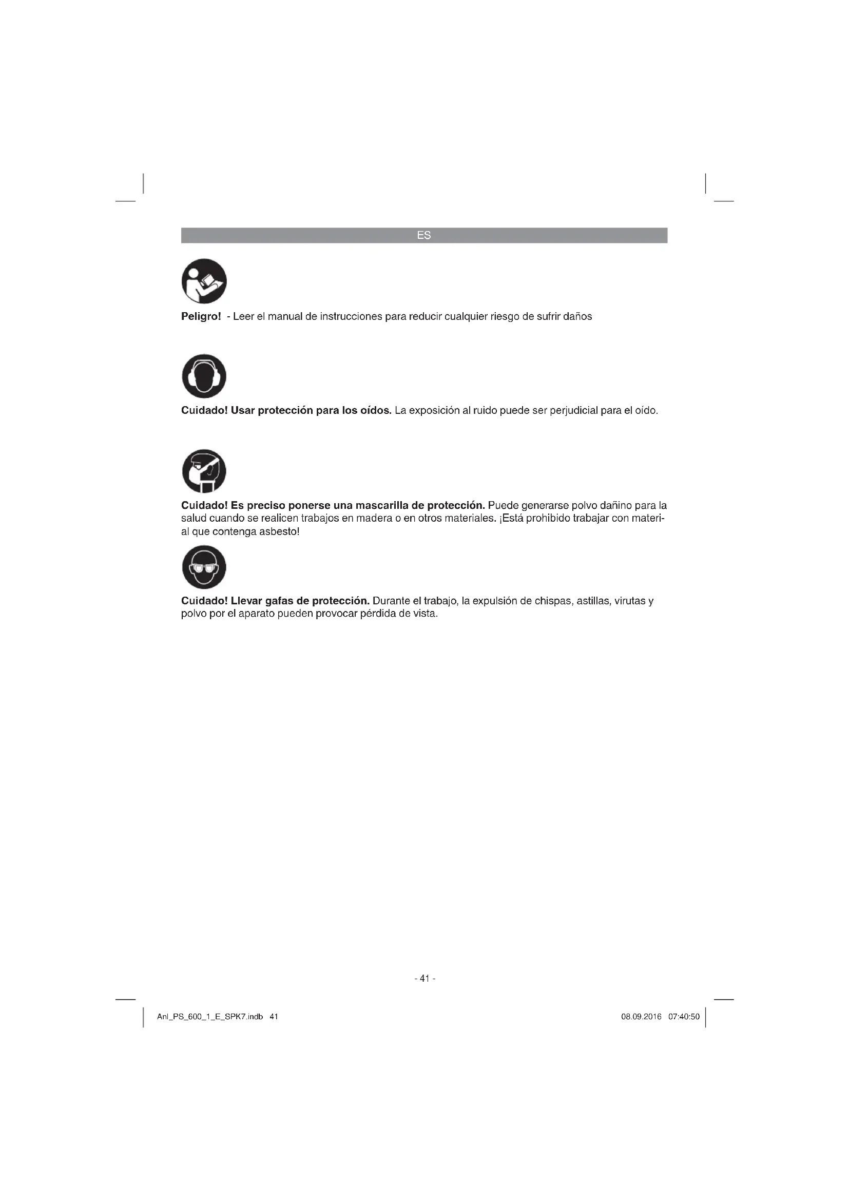 Peligro! - Leer el manual de instrucciones para reducir cualquier riesgo de sufrir daños Cuidado! Usar protección para los oídos. La exposición al ruido puede ser perjudicial para el oído. Cuidado! Llevar gafas de protección. Durante el trabajo, la expulsión de chispas, astillas, virutas y polvo por el aparato pueden provocar pérdida de vista. Cuidado! Es preciso ponerse una mascarilla de protección. Puede generarse polvo dañino para la salud cuando se realicen trabajos en madera o en otros materiales. ¡Está prohibido trabajar con materi- al que contenga asbesto! Anl_PS_600_1_E_SPK7.indb 41Anl_PS_600_1_E_SPK7.indb 41 08.09.2016 07:40:5008.09.2016 07:40:50ES