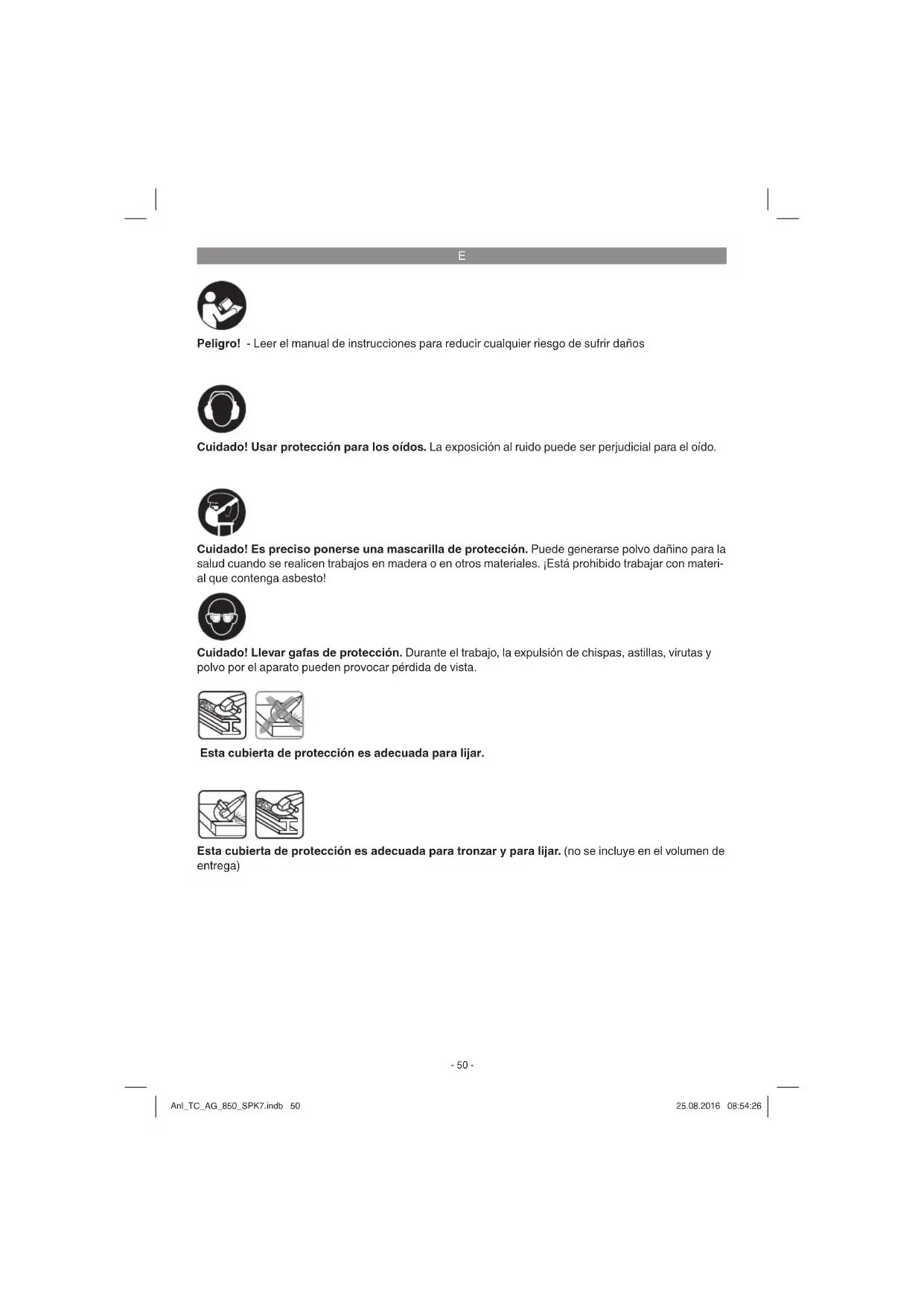 Peligro! - Leer el manual de instrucciones para reducir cualquier riesgo de sufrir daños Cuidado! Usar protección para los oídos. La exposición al ruido puede ser perjudicial para el oído. Cuidado! Llevar gafas de protección. Durante el trabajo, la expulsión de chispas, astillas, virutas y polvo por el aparato pueden provocar pérdida de vista. Cuidado! Es preciso ponerse una mascarilla de protección. Puede generarse polvo dañino para la salud cuando se realicen trabajos en madera o en otros materiales. ¡Está prohibido trabajar con materi- al que contenga asbesto! Esta cubierta de protección es adecuada para tronzar y para lijar. (no se incluye en el volumen de entrega) Esta cubierta de protección es adecuada para lijar. Anl_TC_AG_850_SPK7.indb 50Anl_TC_AG_850_SPK7.indb 50 25.08.2016 08:54:2625.08.2016 08:54:26E