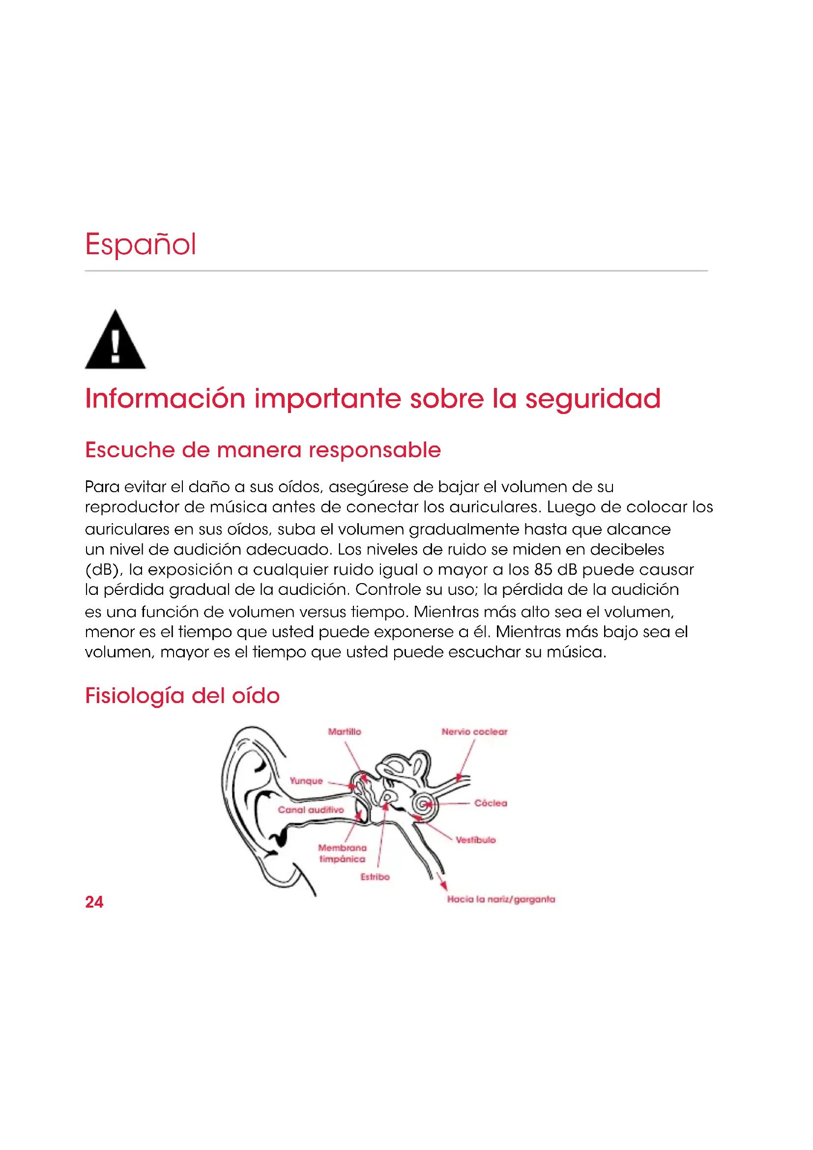 dès aujourd’hui www.beatsbydre.com/register Oui Non24 Español Información importante sobre la seguridad Escuche de manera responsable Para evitar el daño a sus oídos, asegúrese de bajar el volumen de su reproductor de música antes de conectar los auriculares. Luego de colocar los auriculares en sus oídos, suba el volumen gradualmente hasta que alcance un nivel de audición adecuado. Los niveles de ruido se miden en decibeles (dB), la exposición a cualquier ruido igual o mayor a los 85 dB puede causar la pérdida gradual de la audición. Controle su uso; la pérdida de la audición es una función de volumen versus tiempo. Mientras más alto sea el volumen, menor es el tiempo que usted puede exponerse a él. Mientras más bajo sea el volumen, mayor es el tiempo que usted puede escuchar su música. Fisiología del oído Martillo Nervio coclear Estribo Membrana timpánica Canal auditivo Cóclea Yunque Vestíbulo Hacia la nariz/garganta25 Español