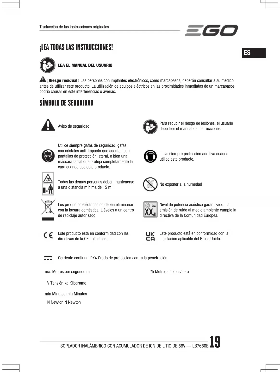 Nivel de potencia acústica garantizado. La emisión de ruido al medio ambiente cumple la directiva de la Comunidad Europea.Este producto está en conformidad con las directivas de la CE aplicables.Este producto está en conformidad con la legislación aplicable del Reino Unido.Corriente continua IPX4 Grado de protección contra la penetraciónm/s Metros por segundo m /h Metros cúbicos/horaV Tensión kg Kilogramomin Minutos min MinutosN Newton N NewtonTraducción de las instrucciones originalesSOPLADOR INALÁMBRICO CON ACUMULADOR DE ION DE LITIO DE 56V — LB7650E20