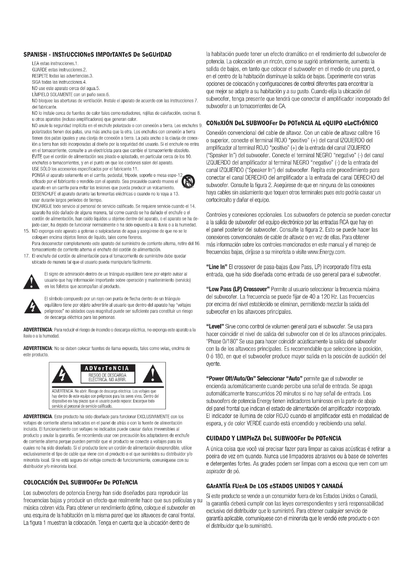 - consulter le détaillant ou un technicien radio/TV compétent sur ce sujet. Homologation comme appareil numérique de classe B au titre des modalités de vérification FCC section 15. Attention : Les changements ou modifications non expressément approuvés par le fabricant peuvent annuler le droit de l’utilisateur à utiliser cet appareil. Cet appareil numérique de la classe B est conforme à la norme NMB-003 du Canada.SpanISH - InStrUCCIoneS ImportanteS De SeGUrIDaD LEA estas instrucciones.1. GUARDE estas instrucciones.2. RESPETE todas las advertencias.3. SIGA todas las instrucciones.4. NO use este aparato cerca del agua.5. LÍMPIELO SOLAMENTE con un paño seco.6. NO bloquee las aberturas de ventilación. Instale el aparato de acuerdo con las instrucciones 7. del fabricante. NO lo instale cerca de fuentes de calor tales como radiadores, rejillas de calefacción, cocinas 8. u otros aparatos (incluso amplificadores) que generan calor. NO anule la seguridad implícita en el enchufe polarizado o con conexión a tierra. Los enchufes 9. polarizados tienen dos patas, una más ancha que la otra. Los enchufes con conexión a tierra tienen dos patas iguales y una clavija de conexión a tierra. La pata ancha o la clavija de conex- ión a tierra han sido incorporadas al diseño por la seguridad del usuario. Si el enchufe no entra en el tomacorriente, consulte a un electricista para que cambie el tomacorriente obsoleto. EVITE que el cordón de alimentación sea pisado o aplastado, en particular cerca de los 10. enchufes o tomacorrientes, y en el punto en que los cordones salen del aparato. USE SÓLO los accesorios especificados por el fabricante.11. PONGA el aparato solamente en el carrito, pedestal, trípode, soporte o mesa espe-12. cificado por el fabricante o vendido con el aparato. Sea precavido cuando mueva el aparato en un carrito para evitar las lesiones que pueda producir un volcamiento. DESENCHUFE el aparato durante las tormentas eléctricas o cuando no lo vaya a 13. usar durante largos períodos de tiempo. ENCARGUE todo servicio al personal de servicio calificado. Se requiere servicio cuando el 14. aparato ha sido dañado de alguna manera, tal como cuando se ha dañado el enchufe o el cordón de alimentación, han caído líquidos u objetos dentro del aparato, o el aparato se ha de- jado caer, ha dejado de funcionar normalmente o ha sido expuesto a la lluvia o a la humedad. NO exponga este aparato a goteras o salpicaduras de agua y asegúrese de que no se le 15. coloquen encima objetos llenos de líquido, tales como floreros. Para desconectar completamente este aparato del suministro de corriente alterna, retire del 16. tomacorriente de corriente alterna el enchufe del cordón de alimentación. El enchufe del cordón de alimentación para el tomacorriente de suministro debe quedar 17. ubicado de manera tal que el usuario pueda manipularlo fácilmente. El signo de admiración dentro de un triángulo equilátero tiene por objeto avisar al usuario que hay información importante sobre operación y mantenimiento (servicio) en los folletos que acompañan al producto. El símbolo compuesto por un rayo con punta de flecha dentro de un triángulo equilátero tiene por objeto advertirle al usuario que dentro del aparato hay “voltajes peligrosos” no aislados cuya magnitud puede ser suficiente para constituir un riesgo de descarga eléctrica para las personas. ADVERTENCIA: Para reducir el riesgo de incendio o descarga eléctrica, no exponga este aparato a la lluvia o a la humedad. ADVERTENCIA: No se deben colocar fuentes de llama expuesta, tales como velas, encima de este producto. ADVERTENCIA. Este producto ha sido diseñado para funcionar EXCLUSIVAMENTE con los voltajes de corriente alterna indicados en el panel de atrás o con la fuente de alimentación incluida. El funcionamiento con voltajes no indicados puede causar daños irreversibles al producto y anular la garantía. Se recomienda usar con precaución los adaptadores de enchufe de corriente alterna porque pueden permitir que el producto se conecte a voltajes para los cuales no ha sido diseñado. Si el producto tiene un cordón de alimentación desprendible, utilice exclusivamente el tipo de cable que viene con el producto o el que suministra su distribuidor y/o minorista local. Si no está seguro del voltaje correcto de funcionamiento, comuníquese con su distribuidor y/o minorista local. CoLoCaCIÓn DeL SUBWoofer De potenCIa Los subwoofers de potencia Energy han sido diseñados para reproducir las frecuencias bajas y producir un efecto que realmente hace que sus películas y su música cobren vida. Para obtener un rendimiento óptimo, coloque el subwoofer en una esquina de la habitación en la misma pared que los altavoces de canal frontal. La figura 1 muestran la colocación. Tenga en cuenta que la ubicación dentro de la habitación puede tener un efecto dramático en el rendimiento del subwoofer de potencia. La colocación en un rincón, como se sugirió anteriormente, aumenta la salida de bajos, en tanto que colocar el subwoofer en el medio de una pared, o en el centro de la habitación disminuye la salida de bajos. Experimente con varias opciones de colocación y configuraciones de control diferentes para encontrar la que mejor se adapte a su habitación y a su gusto. Cuando elija la ubicación del subwoofer, tenga presente que tendrá que conectar el amplificador incorporado del subwoofer a un tomacorrientes de CA. ConeXIÓn DeL SUBWoofer De potenCIa aL eQUIpo eLeCtrÓnICo Conexión convencional del cable de altavoz. Con un cable de altavoz calibre 16 o superior, conecte el terminal ROJO “positivo” (+) del canal IZQUIERDO del amplificador al terminal ROJO “positivo” (+) de la entrada del canal IZQUIERDO (“Speaker In”) del subwoofer. Conecte el terminal NEGRO “negativo” (-) del canal IZQUIERDO del amplificador al terminal NEGRO “negativo” (-) de la entrada del canal IZQUIERDO (“Speaker In”) del subwoo