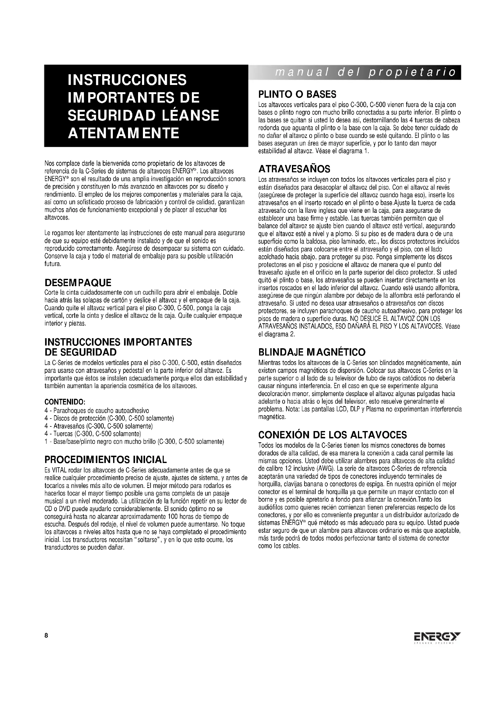 son el resultado de una amplia investigación en reproducción sonora de precisión y constituyen lo más avanzado en altavoces por su diseño y rendimiento. El empleo de los mejores componentes y materiales para la caja, así como un sofisticado proceso de fabricación y control de calidad, garantizan muchos años de funcionamiento excepcional y de placer al escuchar los altavoces. Le rogamos leer atentamente las instrucciones de este manual para asegurarse de que su equipo esté debidamente instalado y de que el sonido es reproducido correctamente. Asegúrese de desempacar su sistema con cuidado. Conserve la caja y todo el material de embalaje para su posible utilización futura. DESEMPAQUE Corte la cinta cuidadosamente con un cuchillo para abrir el embalaje. Doble hacia atrás las solapas de cartón y deslice el altavoz y el empaque de la caja. Cuando quite el altavoz vertical para el piso C-300, C-500, ponga la caja vertical, corte la cinta y deslice el altavoz de la caja. Quite cualquier empaque interior y piezas. INSTRUCCIONES IMPORTANTES DE SEGURIDAD La C-Series de modelos verticales para el piso C-300, C-500, están diseñados para usarse con atravesaños y pedestal en la parte inferior del altavoz. Es importante que éstos se instalen adecuadamente porque ellos dan estabilidad y también aumentan la apariencia cosmética de los altavoces. CONTENIDO: