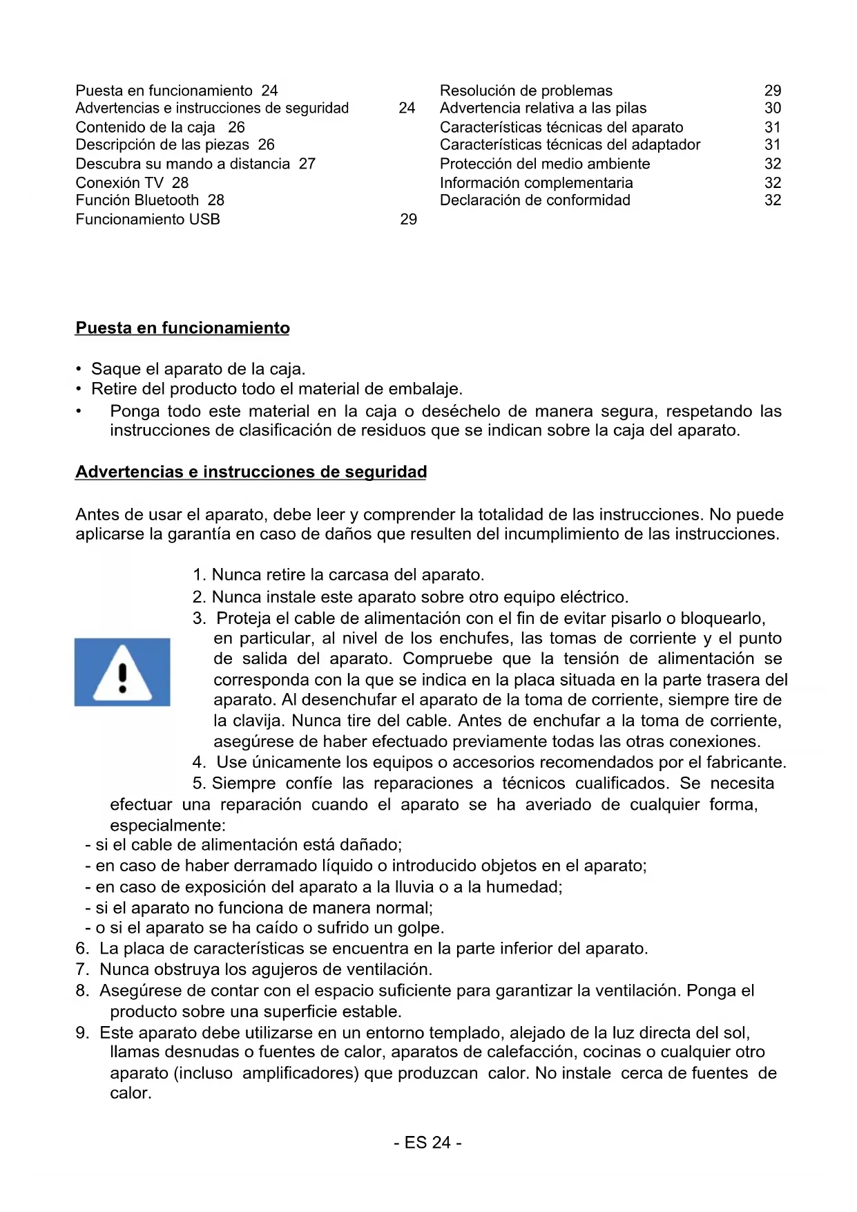 Contenido de la caja 26 Descripción de las piezas 26 Descubra su mando a distancia 27 Conexión TV 28 Función Bluetooth 28 Funcionamiento USB 29 Resolución de problemas 29 Advertencia relativa a las pilas 30 Características técnicas del aparato 31 Características técnicas del adaptador 31 Protección del medio ambiente 32 Información complementaria 32 Declaración de conformidad 32- ES 25 -