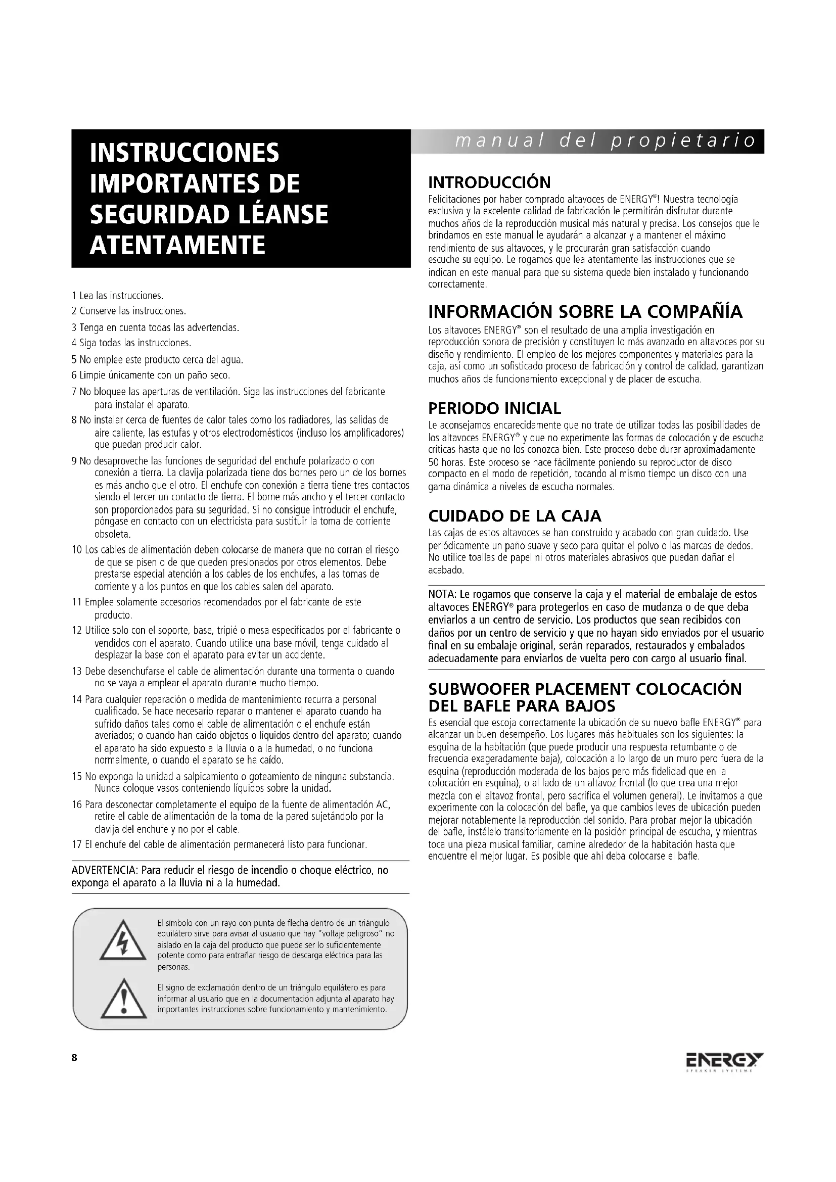 Los altavoces ENERGY son el resultado de una amplia investigación enreproducción sonora de precisión y constituyen lo más avanzado en altavoces por sudiseño y rendimiento. El empleo de los mejores componentes y materiales para lacaja, así como un sofisticado proceso de fabricación y control de calidad, garantizanmuchos años de funcionamiento excepcional y de placer de escucha. PERIODO INICIAL Le aconsejamos encarecidamente que no trate de utilizar todas las posibilidades delos altavoces ENERGY y que no experimente las formas de colocación y de escuchacríticas hasta que no los conozca bien. Este proceso debe durar aproximadamente50 horas. Este proceso se hace fácilmente poniendo su reproductor de discocompacto en el modo de repetición, tocando al mismo tiempo un disco con unagama dinámica a niveles de escucha normales.
