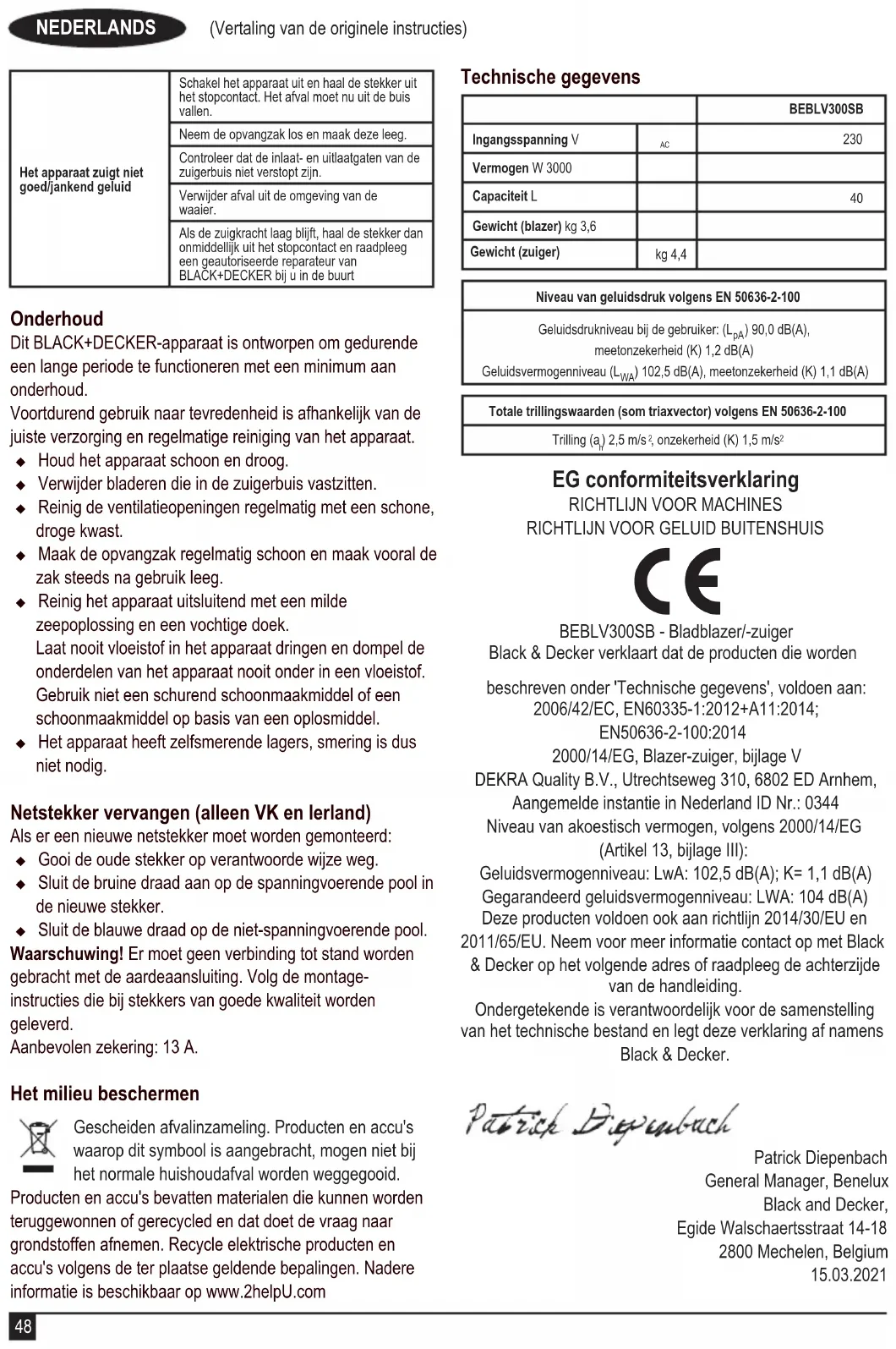 BEBLV300SB - Soplador aspirador Black & Decker declara que los productos descritos en “datos técnicos” cumplen las siguientes normas: 2006/42/CE, EN60335-1:2012+A11:2014; EN50636-2-100:2014 2000/14/CE, Soplador aspirador, Anexo V DEKRA Quality B.V., Utrechtseweg 310, 6802 ED Arnhem, Países Bajos, ID del organismo noticado 0344 Nivel de potencia acústica de acuerdo con la directiva 2000/14/CE (Artículo 13, Anexo III): Nivel de potencia acústica: LwA: 102,5 dB(A); K = 1,1 dB(A) Nivel de potencia acústica garantizado: LWA: 104 dB(A) Estos productos también cumplen las Directivas 2014/30/UE y 2011/65/UE. Para más información, póngase en contacto con Black & Decker en la siguiente dirección o consulte la parte posterior del manual. El que suscribe es responsable de la compilación del archivo técnico y realiza esta declaración en nombre de Black & Decker. Patrick Diepenbach General Manager, Benelux Black and Decker, Egide Walschaertsstraat 14-18 2800 Mechelen, Belgium