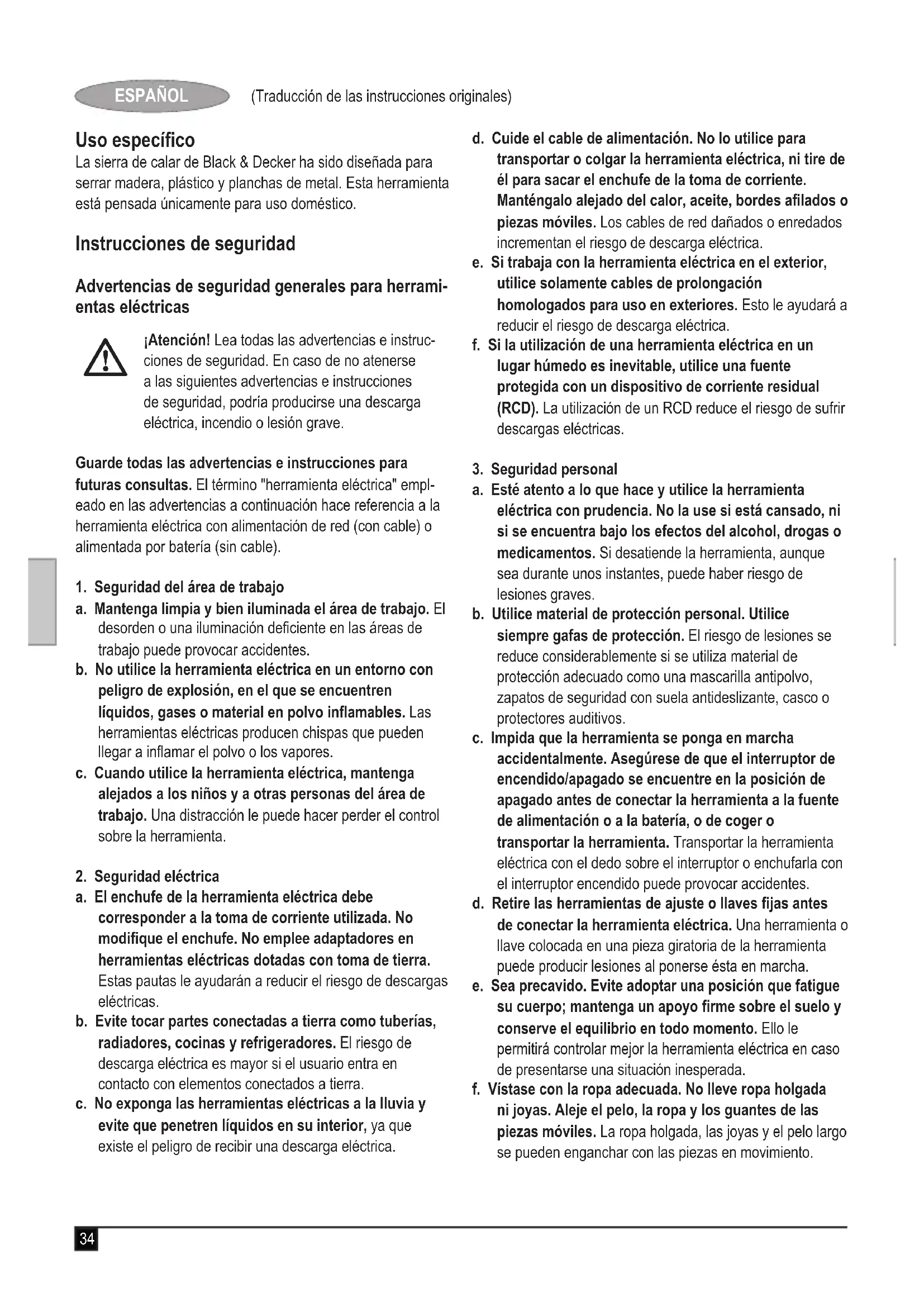 Kevin Hewitt Vicepresidente de Ingeniería global Black & Decker Europa, 210 Bath Road, Slough, Berkshire, SL1 3YD Reino Unido 27/06/2011 Garantía Black & Decker confía plenamente en la calidad de sus pro- ductos y ofrece una garantía extraordinaria. Esta declaración de garantía es un añadido, y en ningún caso un perjuicio para sus derechos legales. La garantía es válida dentro de los territorios de los Estados miembros de la Unión Europea y de los de la Zona Europea de Libre Comercio. Si un producto Black & Decker resultara defectuoso debido a materiales o mano de obra defectuosos o a la falta de confor- midad, Black & Decker garantiza, dentro de los 24 meses de la fecha de compra, la sustitución de las piezas defectuosas, la reparación de los productos sujetos a un desgaste y rotura razonables o la sustitución de tales productos para garantizar al cliente el mínimo de inconvenientes, a menos que: u El producto se ha utilizado con propósitos comerciales, profesionales o de alquiler. u El producto se ha sometido a un uso inadecuado o negli- gente. u El producto ha sufrido daños causados por objetos o sustancias extrañas o accidentes. u Se hayan realizado reparaciones por parte de personas que no sean del servicio técnico autorizado o personal de servicios de Black & Decker. Para reclamar en garantía, será necesario que presente la prueba de compra al vendedor o al agente de servicio técnico autorizado. Puede consultar la dirección de su agente de servicio técnico más cercano si se pone en contacto con la ocina local de Black & Decker en la dirección que se indica en este manual. Como opción alternativa, puede consultar la lista de los agentes de servicio técnico autorizados de Black & Decker y obtener la información completa de nuestros servi- cios de posventa y los contactos disponibles en la siguiente dirección de Internet: www.2helpU.com Visite el sitio web www.blackanddecker.es para registrar su nuevo producto Black & Decker y estar al día sobre productos y ofertas especiales. Encontrará información adicional sobre la marca Black & Decker y nuestra gama de productos en www.blackanddecker.es.40 (Tradução das instruções originais) PORTUGUÊS Utilização prevista A sua serra eléctrica Black & Decker foi concebida para serrar madeira, plástico e chapas metálicas. Esta ferramenta destina-se apenas a utilização doméstica. Instruções de segurança Avisos de segurança gerais para ferramentas eléctricas