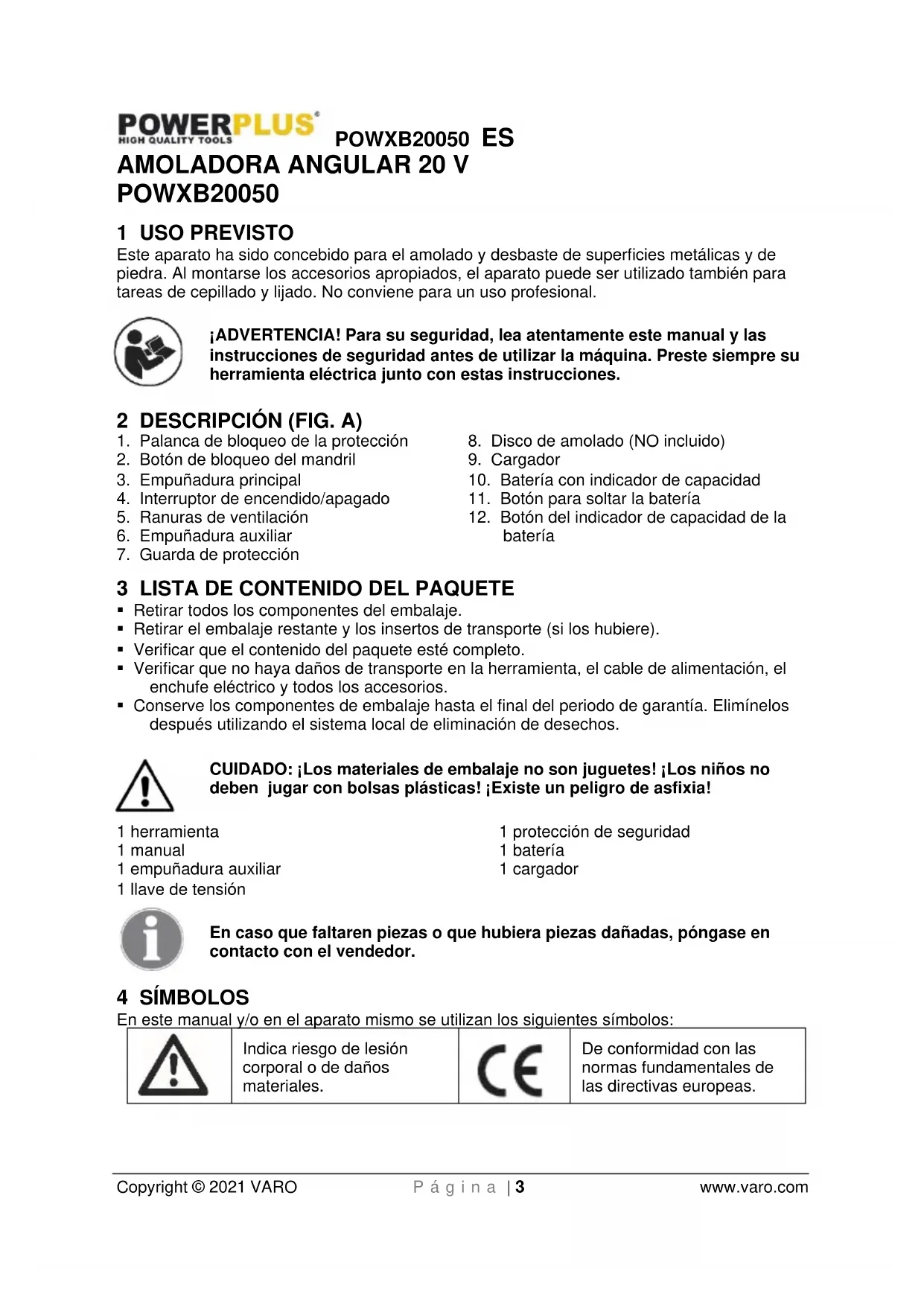 - Mantenimiento. Verifique la alineación o la unión de las piezas móviles, la ausencia de piezas y cualquier otra situación que pudiere afectar el funcionamiento de la herramienta. Si la herramienta estuviere dañada, hágala reparar antes de utilizarla. Muchos accidentes se deben a falta de mantenimiento.POWXB20050 ES Copyright © 2021 VARO P á g i n a | 6 www.varo.com