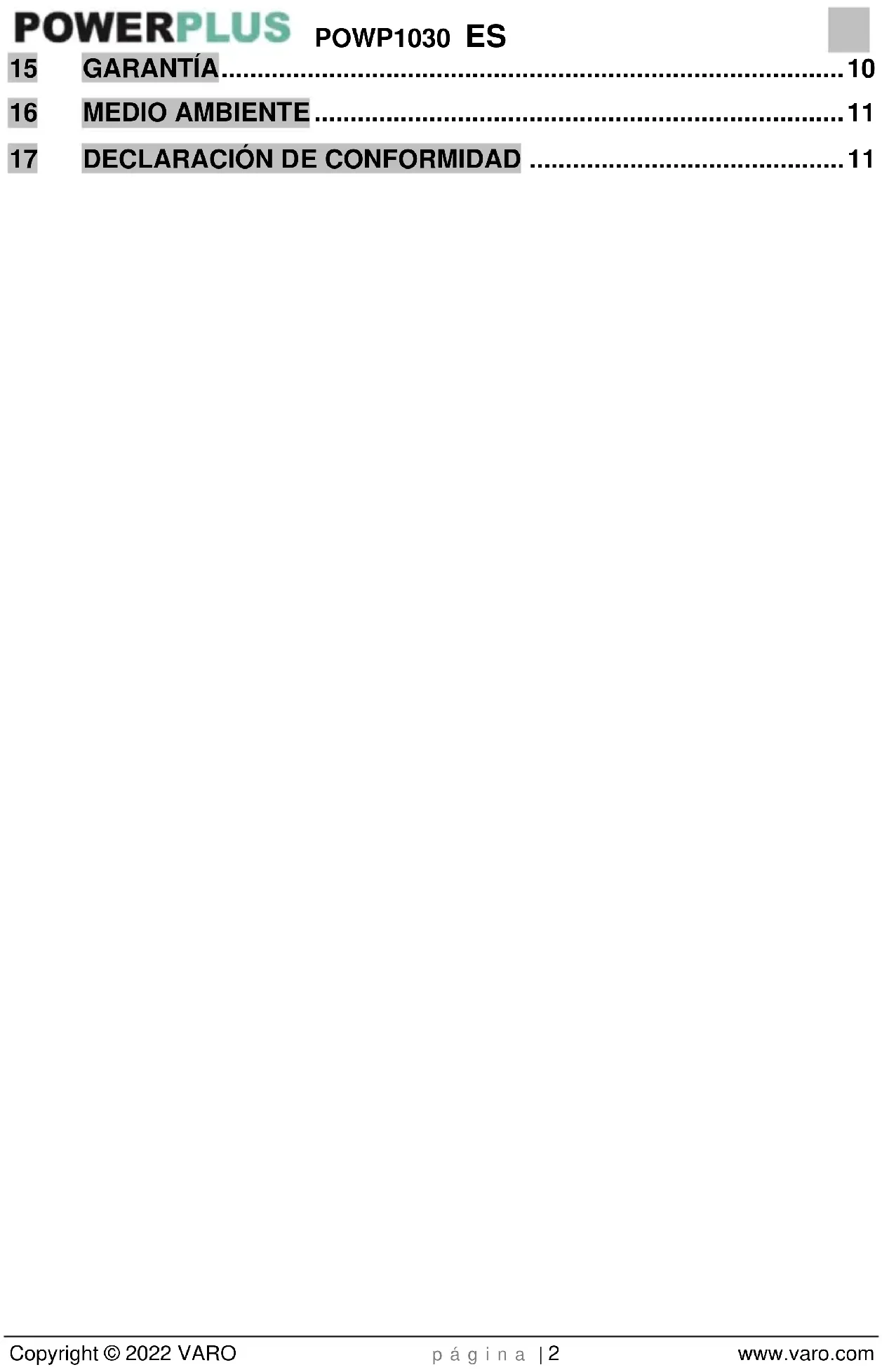 - No dañe el cable. Nunca utilice el cable para transportar, tirar o desconectar la herramienta eléctrica. Mantenga el cable lejos de fuentes de calor, aceite, bordes afilados o piezas en movimiento. Un cable dañado o enredado aumenta el riesgo de descargas eléctricas.POWP1030 ES Copyright © 2022 VARO p á g i n a | 5 www.varo.com