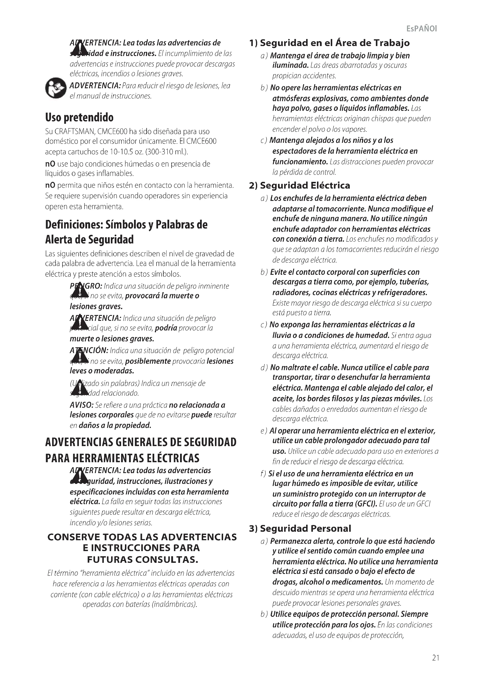 (Utilizado sin palabras) Indica un mensaje de seguridadrelacionado. AVISO: Se refiere a una práctica no relacionada a lesiones corporales que de no evitarse puede resultar en daños a lapropiedad. Uso pretendido Su CRAFTSMAN, CMCE600 ha sido diseñada para uso doméstico por el consumidor únicamente. El CMCE600 acepta cartuchos de 10-10.5 oz. (300-310 ml.). nO use bajo condiciones húmedas o en presencia de líquidos o gases inflamables. nO permita que niños estén en contacto con la herramienta. Se requiere supervisión cuando operadores sin experiencia operen esta herramienta. Español (traducido de las instrucciones originales)