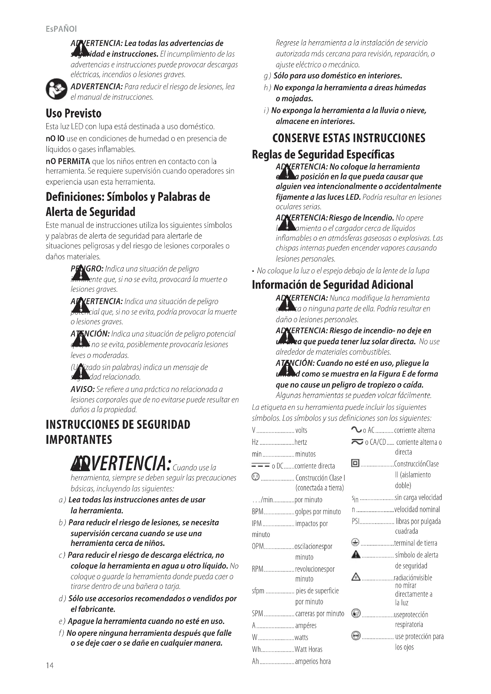 (Utilizado sin palabras) indica un mensaje de seguridadrelacionado. AVISO: Se refiere a una práctica no relacionada a lesiones corporales que de no evitarse puede resultar en daños a lapropiedad. Uso Previsto Esta luz LED con lupa está destinada a uso doméstico. nO lO use en condiciones de humedad o en presencia de líquidos o gases inflamables. nO PERMiTA que los niños entren en contacto con la herramienta. Se requiere supervisión cuando operadores sin experiencia usan esta herramienta.EsPAñOl