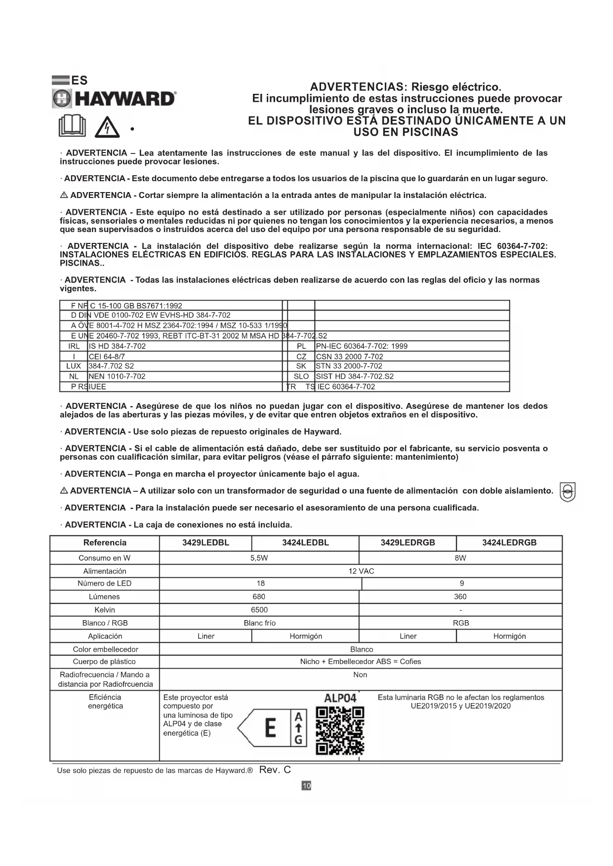 Use solo piezas de repuesto de las marcas de Hayward.® Rev. C UTILIZACIÓN Modo Autónomo (proyector color RVB únicamente) En ausencia de caja RC, los proyectores funcionan de manera autónoma y el usuario puede elegir entre 18 modos: 11 colores fijos y 7 secuencias automáticas de cambio de colores (ver cuadro de las secuencias a continuación). Secuencia Color/Programa Secuencia Color/Programa 1 Color: Blanco 10 Color: Verde 2 Color: Azul 11* Color: Verde esmeralda 3 Color: Laguna azul 12 Programa: Alternacia de colores rápido 4 Color: Cian 13 Programa: Alternacia de colores lenta 5 Color: Púrpura 14 Programa:11coloresjos 6 Color: Magenta 15 Programa: Psicodélico 7 Color: Color de rosa 16 Programa: Azul/Cian/Blanco 8 Color: Rojo 17 Programa: Colores Aleatorio 1 9 Color: Anaranjado 18 Programa: Colores Aleatorio 2 *: Secuencia posiblemente personalizable utilizando y conectando el centro de atención en un caso 34RCLED. El cambio de color puede obtenerse cortando la alimentación de los proyectores durante un tiempo muy corto (<1s). Por interrupciones sucesivas, es posible hacer desfilar los 18 modos de funcionamiento. Después del modo 18, los proyectores vuelven a la primera secuencia automática (modo 1). Para sincronizar los proyectores llevándolos simultáneamente al modo 2, conviene cortar la alimentación durtante unos 2s. Cuando el proyector está puesto en marcha después de una parada de varios segundos (>4s) el proyector se enciende en Blanco durante 15s y luego vuelve al modo en el que se encontraba en el momento de su última extincción. esto permite tener el máximo de alumbrado en caso de que se caiga accidentalmente en el vaso. Seguridad (proyector color RVB únicamente) En caso de aumento anormal de la temperatura en el interior de la bombilla, un dispositivo de seguridad frena el alumbrado y la bombilla emite flashs rojos. En cuanto la temperatura vuelve a la normal, la bombilla reanuda su funcionamiento. En caso de detección de una tensión demasiado baja (<11V) o demasiado elevada (>15V), la bombilla cesa de funcionar y emite flashs verdes. Es indispensable cortar la alimentación de los proyectores para volver a un funcionamiento normal. MANTENIMIENTO Cuando se cambian piezas hay que utilizar piezas de repuesto originales. El cambio de la bombilla debe realizarse fuera del agua. El cambio de la fuente de luz contenida en esta luminaria debe hacerlo únicamente el fabricante o su agente de servicio o una persona con cualificación equivalente. Al cambiar la bombilla y/o el cable, se recomienda cambiar todas las piezas que aseguran la estanqueidad. Al cambiar la bombilla deben cambiarse la junta y los elementos de sellado. Asegúrese de que están montados correctamente. En caso de avería, es necesario cambiar la bombilla LED completa. No la abra ni intente repararla. Para evitar accidentes, si el cable de alimentación o la funda del cable están dañados, el cambio debe hacerlo el fabricante, un Centro de Servicio Autorizado o un técnico cualificado. El cable debe cumplir los siguientes requisitos mecánicos y eléctricos: H05RN-F con una sección mínima de 2x1,5mm2. TRATAMIENTO DE LAS BOMBILLAS Y LOS MANDOS A DISTANCIA AL FINAL DE SU VIDA ÚTIL: El símbolo, contenedor de basura con una raya por debajo, indica la necesidad de recogida selectiva de dispositivos eléctricos o electrónicos. Esto implica que dichos dispositivos y sus residuos no deben eliminarse junto con los residuos domésticos, sino que deben depositarse en un punto de recogida selectiva. Si desea más información, póngase en contacto con su ayuntamiento o con el distribuidor donde compró el producto. La correcta eliminación de los dispositivos eléctricos y electrónicos contribuye a evitar posibles daños al medio ambiente, a la salud humana y ayuda a preservar los recursos naturales.14
