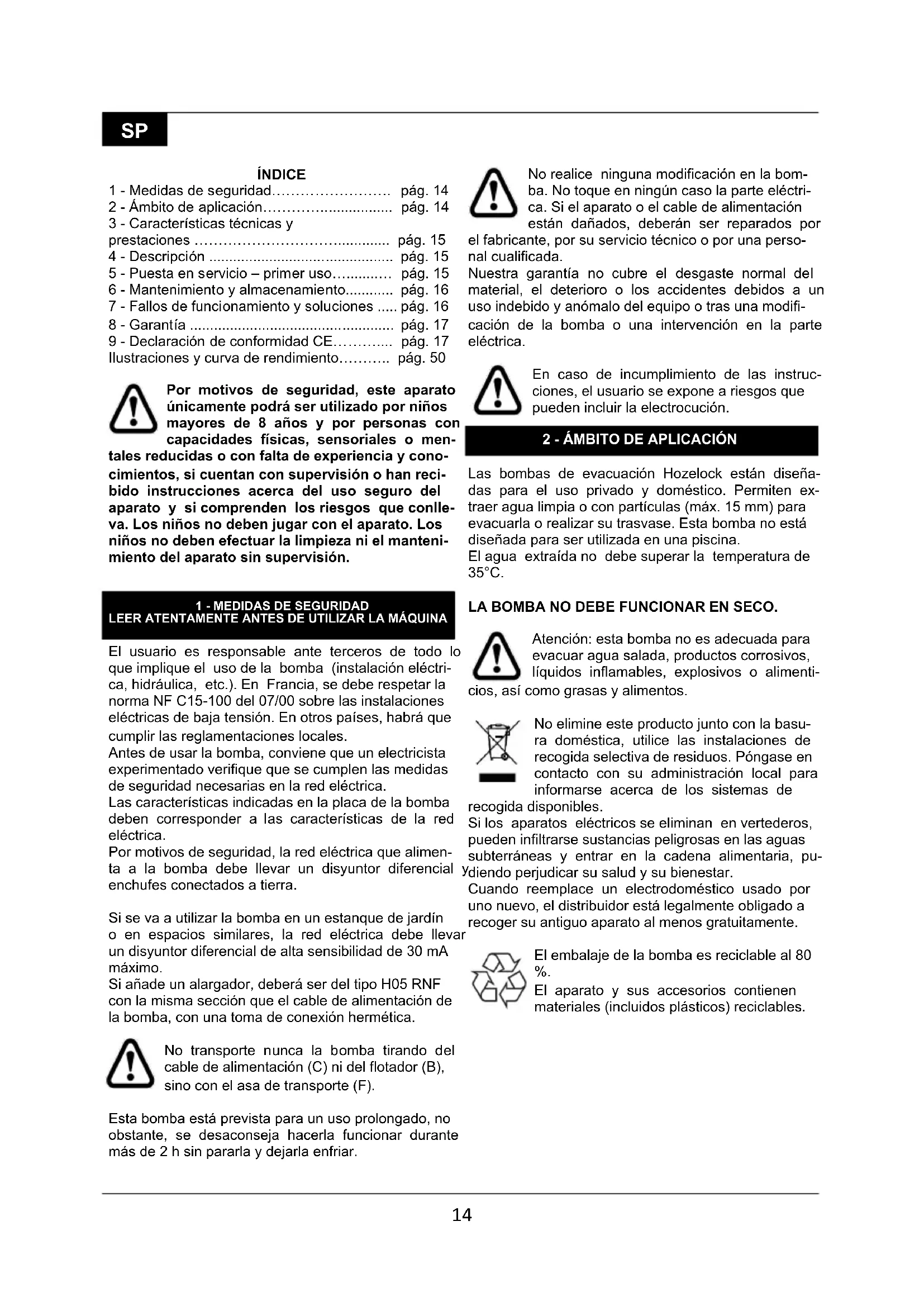 LEER ATENTAMENTE ANTES DE UTILIZAR LA MÁQUINA El usuario es responsable ante terceros de todo lo que implique el uso de la bomba (instalación eléctri- ca, hidráulica, etc.). En Francia, se debe respetar la norma NF C15-100 del 07/00 sobre las instalaciones eléctricas de baja tensión. En otros países, habrá que cumplir las reglamentaciones locales. Antes de usar la bomba, conviene que un electricista experimentado verifique que se cumplen las medidas de seguridad necesarias en la red eléctrica. Las características indicadas en la placa de la bomba deben corresponder a las características de la red eléctrica. Por motivos de seguridad, la red eléctrica que alimen- ta a la bomba debe llevar un disyuntor diferencial y enchufes conectados a tierra. Si se va a utilizar la bomba en un estanque de jardín o en espacios similares, la red eléctrica debe llevar un disyuntor diferencial de alta sensibilidad de 30 mA máximo. Si añade un alargador, deberá ser del tipo H05 RNF con la misma sección que el cable de alimentación de la bomba, con una toma de conexión hermética. No transporte nunca la bomba tirando del cable de alimentación (C) ni del flotador (B), sino con el asa de transporte (F). Esta bomba está prevista para un uso prolongado, no obstante, se desaconseja hacerla funcionar durante más de 2 h sin pararla y dejarla enfriar. No realice ninguna modificación en la bom- ba. No toque en ningún caso la parte eléctri- ca. Si el aparato o el cable de alimentación están dañados, deberán ser reparados por el fabricante, por su servicio técnico o por una perso- nal cualificada. Nuestra garantía no cubre el desgaste normal del material, el deterioro o los accidentes debidos a un uso indebido y anómalo del equipo o tras una modifi- cación de la bomba o una intervención en la parte eléctrica. En caso de incumplimiento de las instruc- ciones, el usuario se expone a riesgos que pueden incluir la electrocución.
