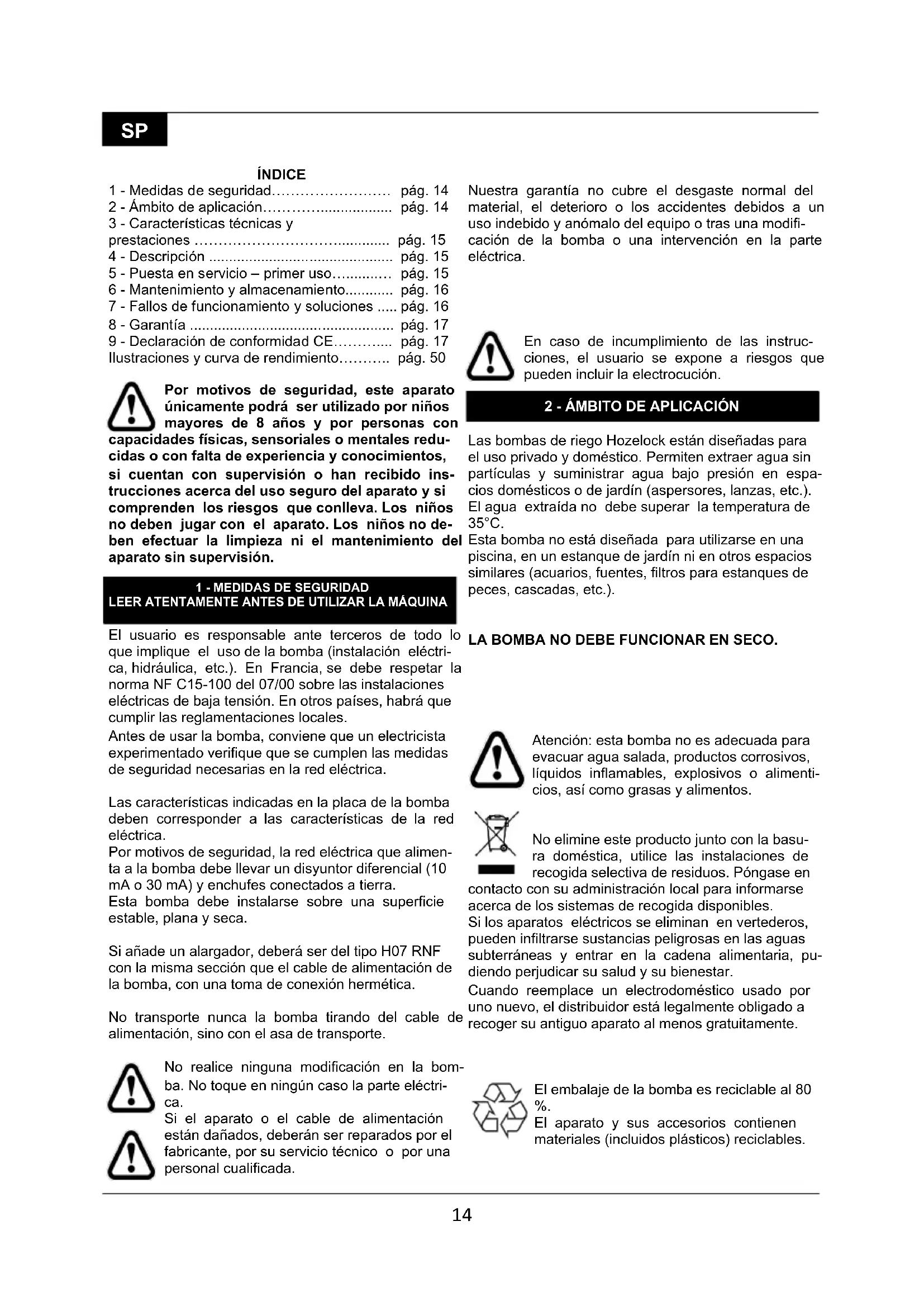 LEER ATENTAMENTE ANTES DE UTILIZAR LA MÁQUINA El usuario es responsable ante terceros de todo lo que implique el uso de la bomba (instalación eléctri- ca, hidráulica, etc.). En Francia, se debe respetar la norma NF C15-100 del 07/00 sobre las instalaciones eléctricas de baja tensión. En otros países, habrá que cumplir las reglamentaciones locales. Antes de usar la bomba, conviene que un electricista experimentado verifique que se cumplen las medidas de seguridad necesarias en la red eléctrica. Las características indicadas en la placa de la bomba deben corresponder a las características de la red eléctrica. Por motivos de seguridad, la red eléctrica que alimen- ta a la bomba debe llevar un disyuntor diferencial (10 mA o 30 mA) y enchufes conectados a tierra. Esta bomba debe instalarse sobre una superficie estable, plana y seca. Si añade un alargador, deberá ser del tipo H07 RNF con la misma sección que el cable de alimentación de la bomba, con una toma de conexión hermética. No transporte nunca la bomba tirando del cable de alimentación, sino con el asa de transporte. No realice ninguna modificación en la bom- ba. No toque en ningún caso la parte eléctri- ca. Si el aparato o el cable de alimentación están dañados, deberán ser reparados por el fabricante, por su servicio técnico o por una personal cualificada. Nuestra garantía no cubre el desgaste normal del material, el deterioro o los accidentes debidos a un uso indebido y anómalo del equipo o tras una modifi- cación de la bomba o una intervención en la parte eléctrica.