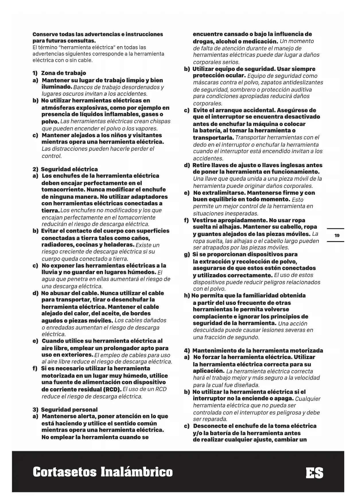 Cortasetos Inalámbrico accesorio o guardar la herramienta. Tales medidas de seguridad preventivas reducen el riesgo de arranque accidental de la herramienta. d) Mantener las herramientas eléctricas que no usa fuera del alcance de los niños y no permita que personas no familiarizadas con la herramienta o con estas instrucciones maneje la herramienta eléctrica. Las herramientas eléctricas son peligrosas en manos de usuarios inexpertos. e) Mantenga las herramientas con cuidado. Compruebe la desalineación o el atasco de las piezas móviles, la ruptura de piezas y cualquier otra situación que pueda afectar el funcionamiento de las herramientas. Si la herramienta está dañada, hágala arreglar antes de usarla. Muchos accidentes son causados por herramientas mantenidas deficientemente. f) Conserve las herramientas de corte afiladas y limpias. Las herramientas mantenidas adecuadamente, con bordes de corte afilados, tienen menos probabilidades de atascarse y son más fáciles de controlar. g) Utilice la herramienta eléctrica, accesorios, brocas de la herramienta, etc. de acuerdo con estas instrucciones y de la manera adecuada para el tipo de herramienta eléctrica, teniendo en cuenta las condiciones de trabajo y el trabajo que se realizará.