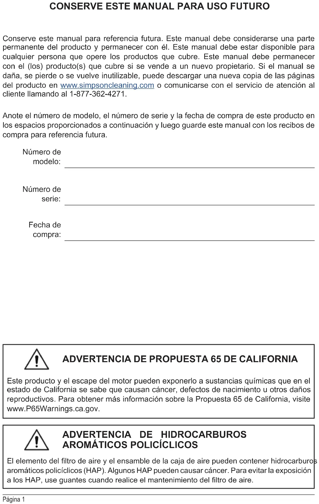 Conserve este manual para referencia futura. Este manual debe considerarse una parte permanente del producto y permanecer con él. Este manual debe estar disponible para cualquier persona que opere los productos que cubre. Este manual debe permanecer con el (los) producto(s) que cubre si se vende a un nuevo propietario. Si el manual se daña, se pierde o se vuelve inutilizable, puede descargar una nueva copia de las páginas del producto en www.simpsoncleaning.com o comunicarse con el servicio de atención al cliente llamando al 1-877-362-4271. Anote el número de modelo, el número de serie y la fecha de compra de este producto en los espacios proporcionados a continuación y luego guarde este manual con los recibos de compra para referencia futura. Número de modelo: Número de serie: Fecha de compra: Este producto y el escape del motor pueden exponerlo a sustancias químicas que en el estado de California se sabe que causan cáncer, defectos de nacimiento u otros daños reproductivos. Para obtener más información sobre la Propuesta 65 de California, visite www.P65Warnings.ca.gov.