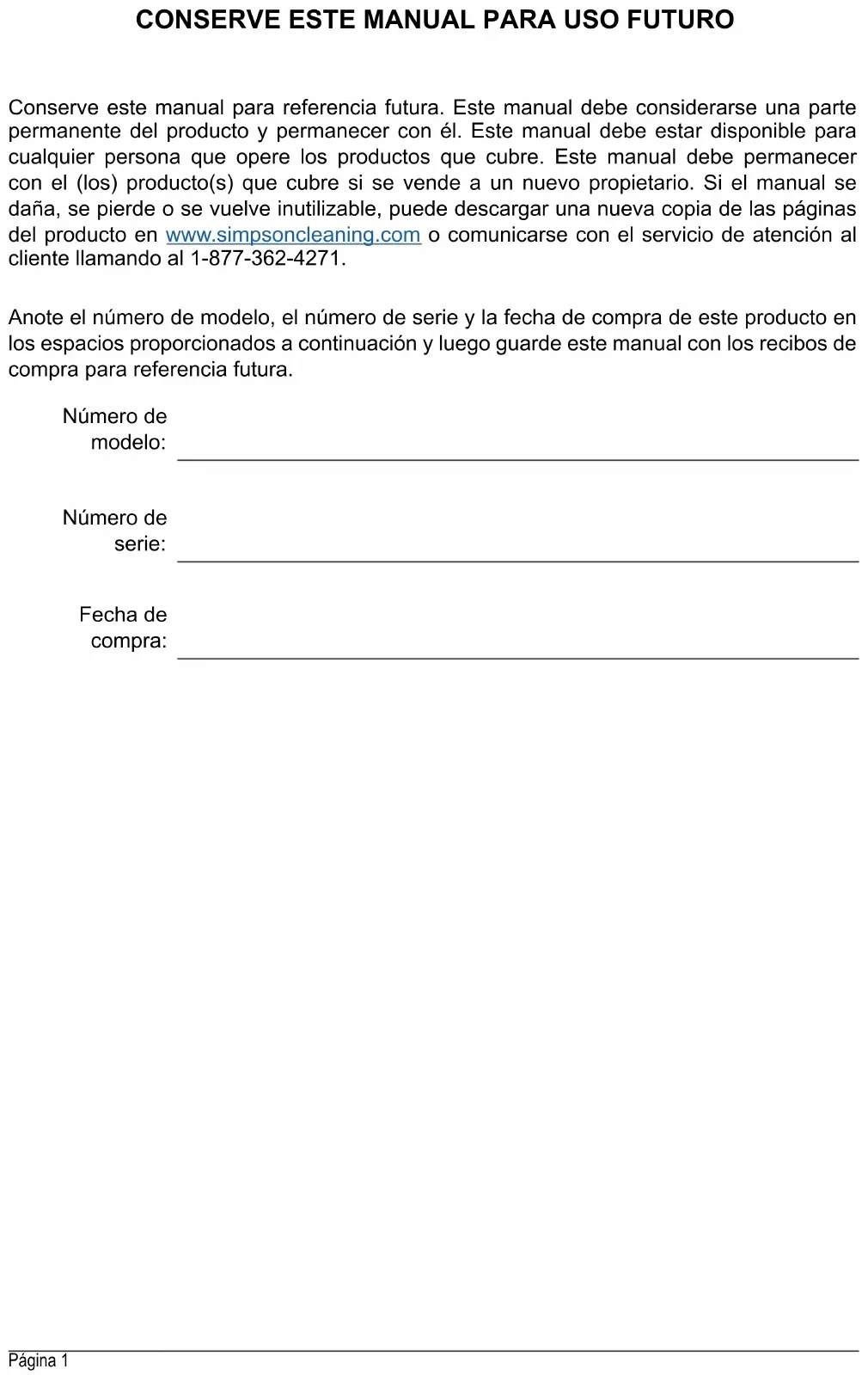 Conserve este manual para referencia futura. Este manual debe considerarse una parte permanente del producto y permanecer con él. Este manual debe estar disponible para cualquier persona que opere los productos que cubre. Este manual debe permanecer con el (los) producto(s) que cubre si se vende a un nuevo propietario. Si el manual se daña, se pierde o se vuelve inutilizable, puede descargar una nueva copia de las páginas del producto en www.simpsoncleaning.com o comunicarse con el servicio de atención al cliente llamando al 1-877-362-4271. Anote el número de modelo, el número de serie y la fecha de compra de este producto en los espacios proporcionados a continuación y luego guarde este manual con los recibos de compra para referencia futura. Número de modelo: Número de serie: Fecha de compra:Página 2