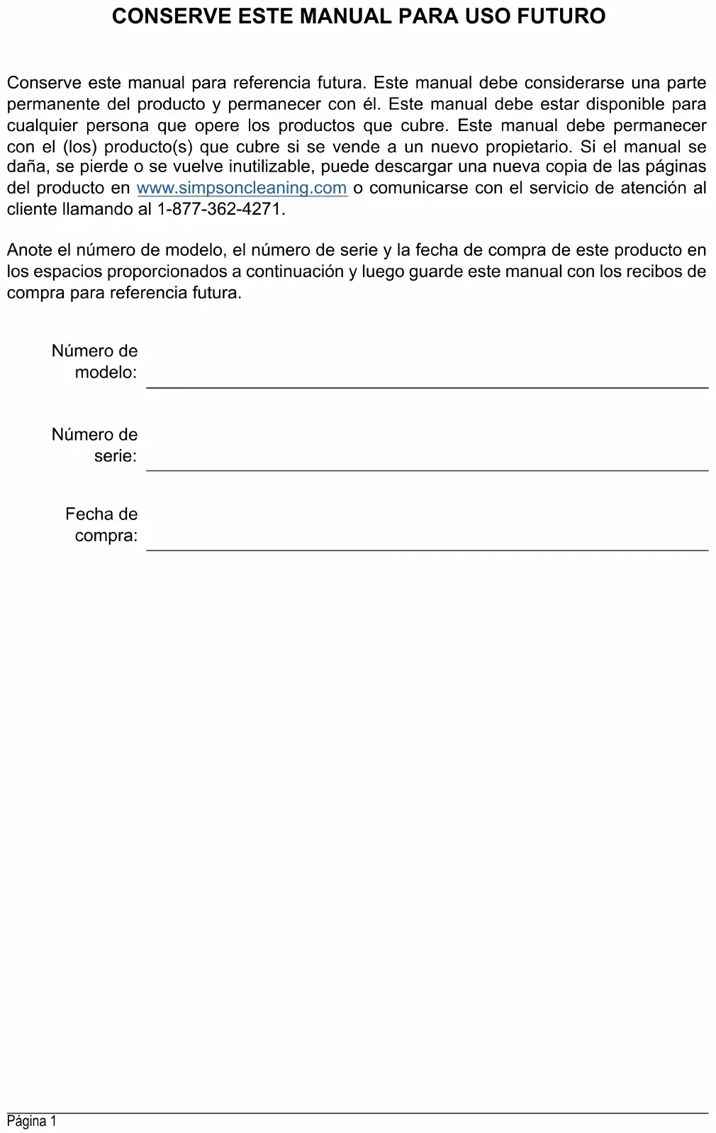 Anote el número de modelo, el número de serie y la fecha de compra de este producto en los espacios proporcionados a continuación y luego guarde este manual con los recibos de compra para referencia futura. Conserve este manual para referencia futura. Este manual debe considerarse una parte permanente del producto y permanecer con él. Este manual debe estar disponible para cualquier persona que opere los productos que cubre. Este manual debe permanecer con el (los) producto(s) que cubre si se vende a un nuevo propietario. Si el manual se daña, se pierde o se vuelve inutilizable, puede descargar una nueva copia de las páginas del producto en www.simpsoncleaning.com o comunicarse con el servicio de atención al cliente llamando al 1-877-362-4271. Número de modelo: Número de serie: Fecha de compra:Página 2