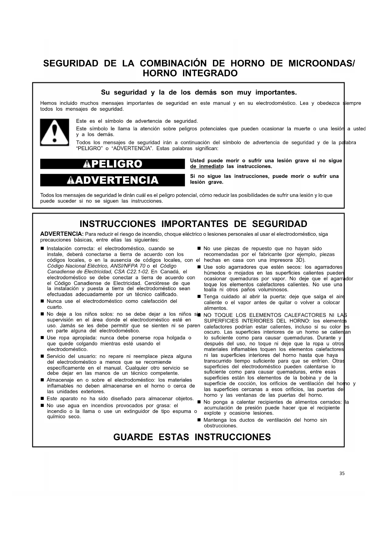 récipient. L’eau dans le contenant doit être chaude. Pour obtenir de l’assistance ou une visite de service : Consulter le guide de démarrage rapide pour obtenir les coordonnées ou communiquer avec le marchand chez qui le four et le four à micro-ondes ont été achetés.35 SEGURIDAD DE LA COMBINACIÓN DE HORNO DE MICROONDAS/ HORNO INTEGRADO Su seguridad y la de los demás son muy importantes. Hemos incluido muchos mensajes importantes de seguridad en este manual y en su electrodoméstico. Lea y obedezca siempre todos los mensajes de seguridad. Este es el símbolo de advertencia de seguridad. Este símbolo le llama la atención sobre peligros potenciales que pueden ocasionar la muerte o una lesión a usted y a los demás. Todos los mensajes de seguridad irán a continuación del símbolo de advertencia de seguridad y de la palabra “PELIGRO” o “ADVERTENCIA”. Estas palabras significan: PELIGRO Usted puede morir o sufrir una lesión grave si no sigue de inmediato las instrucciones. ADVERTENCIA Si no sigue las instrucciones, puede morir o sufrir una lesión grave. Todos los mensajes de seguridad le dirán cuál es el peligro potencial, cómo reducir las posibilidades de sufrir una lesión y lo que puede suceder si no se siguen las instrucciones.