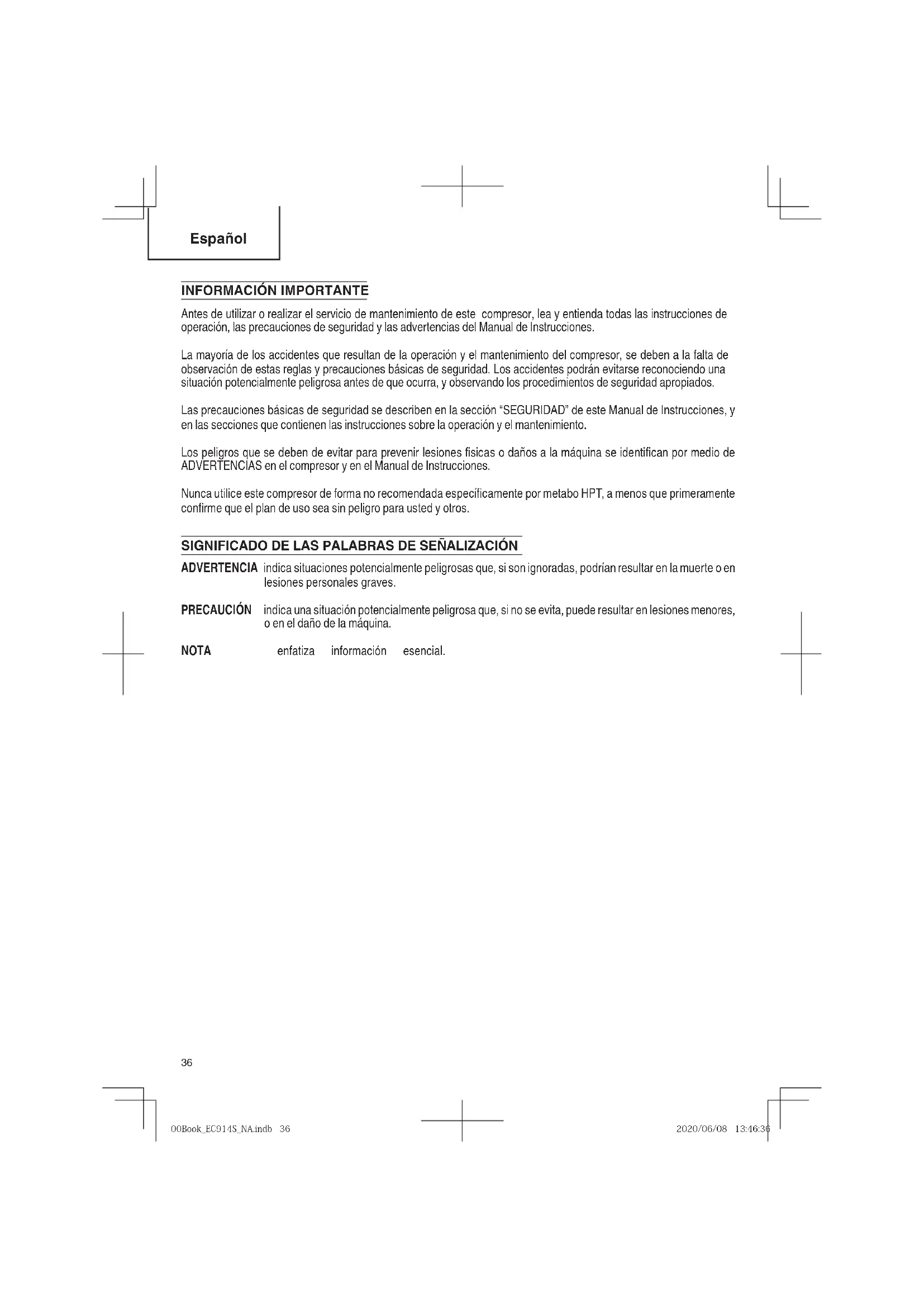 Antes de utilizar o realizar el servicio de mantenimiento de este compresor, lea y entienda todas las instrucciones de operación, las precauciones de seguridad y las advertencias del Manual de Instrucciones. La mayoría de los accidentes que resultan de la operación y el mantenimiento del compresor, se deben a la falta de observación de estas reglas y precauciones básicas de seguridad. Los accidentes podrán evitarse reconociendo una situación potencialmente peligrosa antes de que ocurra, y observando los procedimientos de seguridad apropiados. Las precauciones básicas de seguridad se describen en la sección “SEGURIDAD” de este Manual de Instrucciones, y en las secciones que contienen las instrucciones sobre la operación y el mantenimiento. Los peligros que se deben de evitar para prevenir lesiones fi sicas o daños a la máquina se identifi can por medio de ADVERTENCIAS en el compresor y en el Manual de Instrucciones. Nunca utilice este compresor de forma no recomendada específi camente por metabo HPT, a menos que primeramente confi rme que el plan de uso sea sin peligro para usted y otros. SIGNIFICADO DE LAS PALABRAS DE SEÑALIZACIÓN ADVERTENCIA indica situaciones potencialmente peligrosas que, si son ignoradas, podrían resultar en la muerte o en lesiones personales graves. PRECAUCIÓN indica una situación potencialmente peligrosa que, si no se evita, puede resultar en lesiones menores, o en el daño de la máquina. NOTA enfatiza información esencial. 00BookEC914SNA.indb3600BookEC914SNA.indb36 2020/06/0813:46:362020/06/0813:46:3637 Español