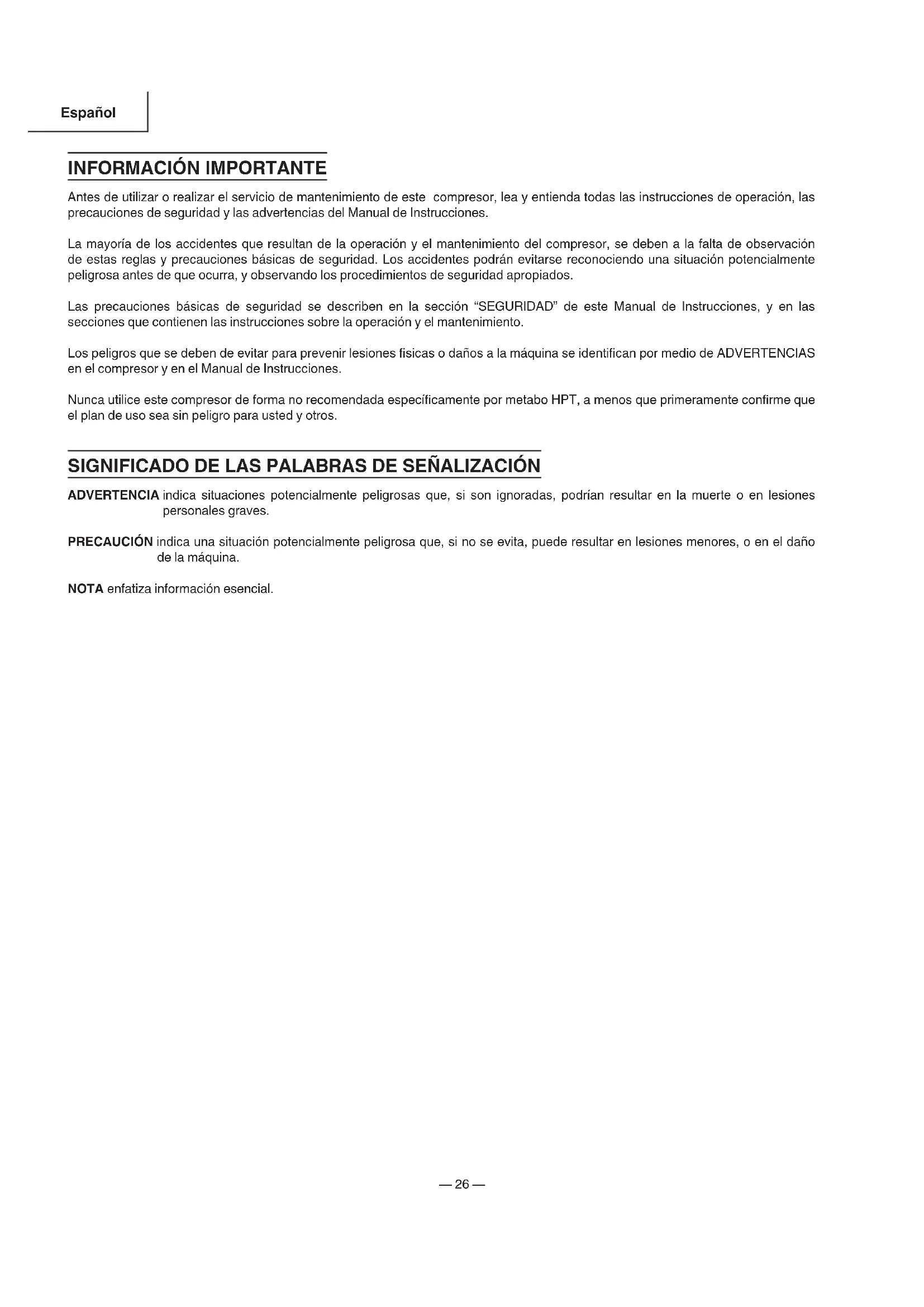Antes de utilizar o realizar el servicio de mantenimiento de este compresor, lea y entienda todas las instrucciones de operación, las precauciones de seguridad y las advertencias del Manual de Instrucciones. La mayoría de los accidentes que resultan de la operación y el mantenimiento del compresor, se deben a la falta de observación de estas reglas y precauciones básicas de seguridad. Los accidentes podrán evitarse reconociendo una situación potencialmente peligrosa antes de que ocurra, y observando los procedimientos de seguridad apropiados. Las precauciones básicas de seguridad se describen en la sección “SEGURIDAD” de este Manual de Instrucciones, y en las secciones que contienen las instrucciones sobre la operación y el mantenimiento. Los peligros que se deben de evitar para prevenir lesiones fi sicas o daños a la máquina se identifi can por medio de ADVERTENCIAS en el compresor y en el Manual de Instrucciones. Nunca utilice este compresor de forma no recomendada específi camente por metabo HPT, a menos que primeramente confi rme que el plan de uso sea sin peligro para usted y otros. SIGNIFICADO DE LAS PALABRAS DE SEÑALIZACIÓN ADVERTENCIA indica situaciones potencialmente peligrosas que, si son ignoradas, podrían resultar en la muerte o en lesiones personales graves. PRECAUCIÓN indica una situación potencialmente peligrosa que, si no se evita, puede resultar en lesiones menores, o en el daño de la máquina. NOTA enfatiza información esencial. 000BookEC99Smetabo.indb26000BookEC99Smetabo.indb26 2018/03/2217:20:202018/03/2217:20:20Español — 27 — SEGURIDAD
