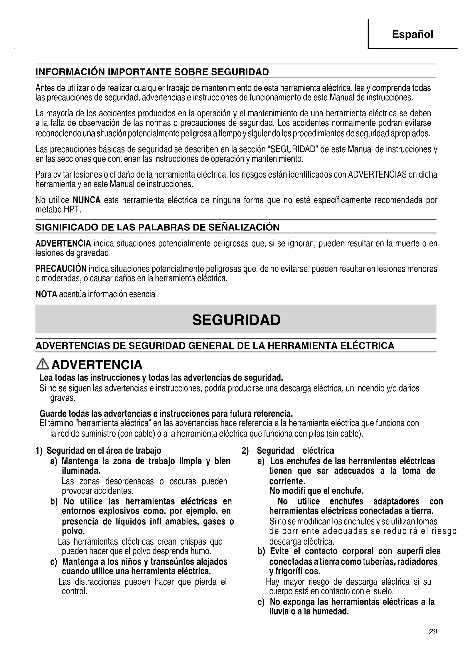 Français 0000G12BYEQ2metabo.indb280000G12BYEQ2metabo.indb28 2022/05/318:31:072022/05/318:31:07INFORMACIÓN IMPORTANTE SOBRE SEGURIDAD Antes de utilizar o de realizar cualquier trabajo de mantenimiento de esta herramienta eléctrica, lea y comprenda todas las precauciones de seguridad, advertencias e instrucciones de funcionamiento de este Manual de instrucciones. La mayoría de los accidentes producidos en la operación y el mantenimiento de una herramienta eléctrica se deben a la falta de observación de las normas o precauciones de seguridad. Los accidentes normalmente podrán evitarse reconociendo una situación potencialmente peligrosa a tiempo y siguiendo los procedimientos de seguridad apropiados. Las precauciones básicas de seguridad se describen en la sección “SEGURIDAD” de este Manual de instrucciones y en las secciones que contienen las instrucciones de operación y mantenimiento. Para evitar lesiones o el daño de la herramienta eléctrica, los riesgos están identifi cados con ADVERTENCIAS en dicha herramienta y en este Manual de instrucciones. No utilice NUNCA esta herramienta eléctrica de ninguna forma que no esté específi camente recomendada por metabo HPT. SIGNIFICADO DE LAS PALABRAS DE SEÑALIZACIÓN ADVERTENCIA indica situaciones potencialmente peligrosas que, si se ignoran, pueden resultar en la muerte o en lesiones de gravedad. PRECAUCIÓN indica situaciones potencialmente peligrosas que, de no evitarse, pueden resultar en lesiones menores o moderadas, o causar daños en la herramienta eléctrica. NOTA acentúa información esencial. SEGURIDAD ADVERTENCIAS DE SEGURIDAD GENERAL DE LA HERRAMIENTA ELÉCTRICA ADVERTENCIA Lea todas las instrucciones y todas las advertencias de seguridad. Si no se siguen las advertencias e instrucciones, podría producirse una descarga eléctrica, un incendio y/o daños graves. Guarde todas las advertencias e instrucciones para futura referencia. El término “herramienta eléctrica” en las advertencias hace referencia a la herramienta eléctrica que funciona con la red de suministro (con cable) o a la herramienta eléctrica que funciona con pilas (sin cable).