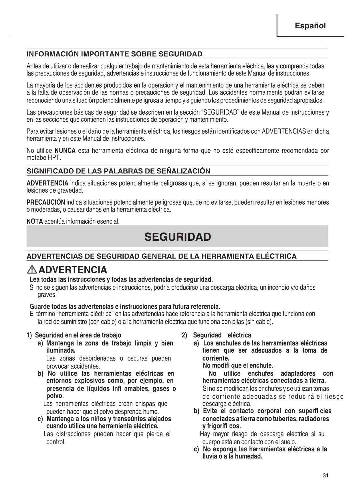 Français 00BookG12VE2metaboNA.indb3000BookG12VE2metaboNA.indb30 2022/05/318:39:162022/05/318:39:16INFORMACIÓN IMPORTANTE SOBRE SEGURIDAD Antes de utilizar o de realizar cualquier trabajo de mantenimiento de esta herramienta eléctrica, lea y comprenda todas las precauciones de seguridad, advertencias e instrucciones de funcionamiento de este Manual de instrucciones. La mayoría de los accidentes producidos en la operación y el mantenimiento de una herramienta eléctrica se deben a la falta de observación de las normas o precauciones de seguridad. Los accidentes normalmente podrán evitarse reconociendo una situación potencialmente peligrosa a tiempo y siguiendo los procedimientos de seguridad apropiados. Las precauciones básicas de seguridad se describen en la sección “SEGURIDAD” de este Manual de instrucciones y en las secciones que contienen las instrucciones de operación y mantenimiento. Para evitar lesiones o el daño de la herramienta eléctrica, los riesgos están identifi cados con ADVERTENCIAS en dicha herramienta y en este Manual de instrucciones. No utilice NUNCA esta herramienta eléctrica de ninguna forma que no esté específi camente recomendada por metabo HPT. SIGNIFICADO DE LAS PALABRAS DE SEÑALIZACIÓN ADVERTENCIA indica situaciones potencialmente peligrosas que, si se ignoran, pueden resultar en la muerte o en lesiones de gravedad. PRECAUCIÓN indica situaciones potencialmente peligrosas que, de no evitarse, pueden resultar en lesiones menores o moderadas, o causar daños en la herramienta eléctrica. NOTA acentúa información esencial. SEGURIDAD ADVERTENCIAS DE SEGURIDAD GENERAL DE LA HERRAMIENTA ELÉCTRICA ADVERTENCIA Lea todas las instrucciones y todas las advertencias de seguridad. Si no se siguen las advertencias e instrucciones, podría producirse una descarga eléctrica, un incendio y/o daños graves. Guarde todas las advertencias e instrucciones para futura referencia. El término “herramienta eléctrica” en las advertencias hace referencia a la herramienta eléctrica que funciona con la red de suministro (con cable) o a la herramienta eléctrica que funciona con pilas (sin cable).