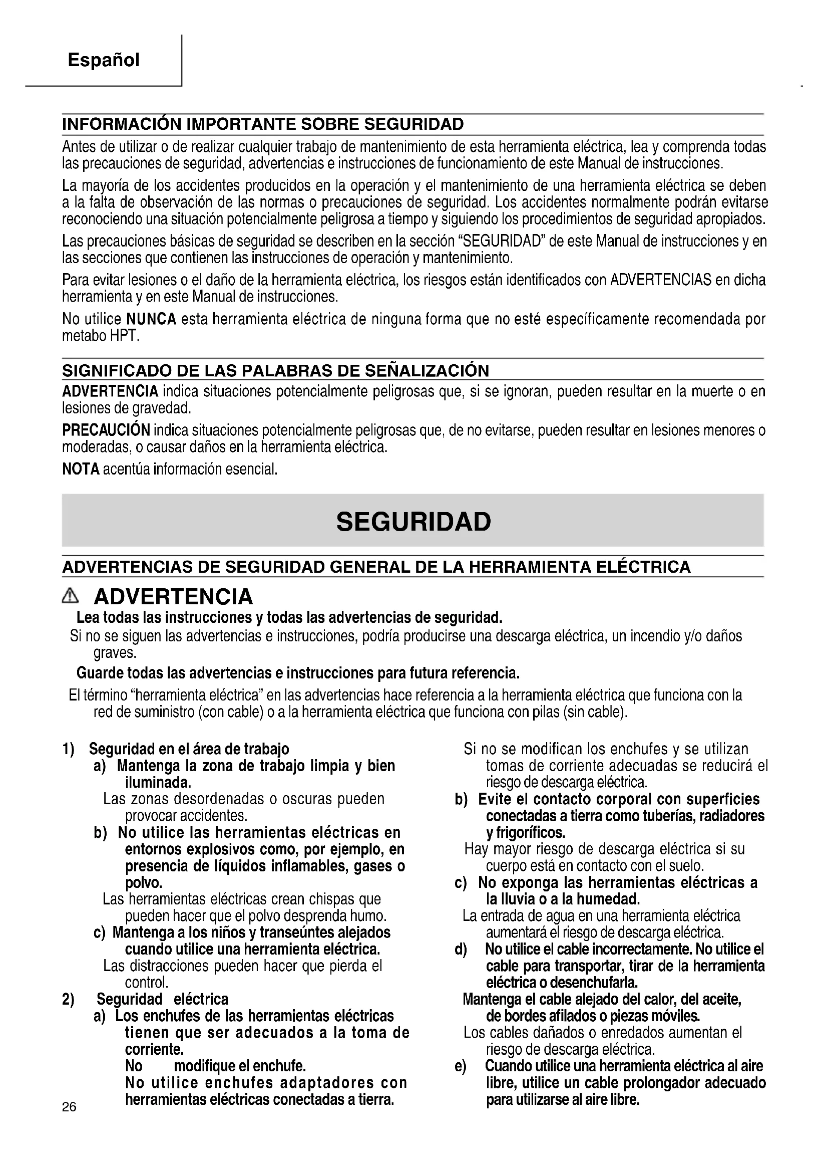 Français 00BookG12SE3.indb2500BookG12SE3.indb25 2020/02/1110:49:392020/02/1110:49:39INFORMACIÓN IMPORTANTE SOBRE SEGURIDAD Antes de utilizar o de realizar cualquier trabajo de mantenimiento de esta herramienta eléctrica, lea y comprenda todas las precauciones de seguridad, advertencias e instrucciones de funcionamiento de este Manual de instrucciones. La mayoría de los accidentes producidos en la operación y el mantenimiento de una herramienta eléctrica se deben a la falta de observación de las normas o precauciones de seguridad. Los accidentes normalmente podrán evitarse reconociendo una situación potencialmente peligrosa a tiempo y siguiendo los procedimientos de seguridad apropiados. Las precauciones básicas de seguridad se describen en la sección “SEGURIDAD” de este Manual de instrucciones y en las secciones que contienen las instrucciones de operación y mantenimiento. Para evitar lesiones o el daño de la herramienta eléctrica, los riesgos están identifi cados con ADVERTENCIAS en dicha herramienta y en este Manual de instrucciones. No utilice NUNCA esta herramienta eléctrica de ninguna forma que no esté específicamente recomendada por metabo HPT. SIGNIFICADO DE LAS PALABRAS DE SEÑALIZACIÓN ADVERTENCIA indica situaciones potencialmente peligrosas que, si se ignoran, pueden resultar en la muerte o en lesiones de gravedad. PRECAUCIÓN indica situaciones potencialmente peligrosas que, de no evitarse, pueden resultar en lesiones menores o moderadas, o causar daños en la herramienta eléctrica. NOTA acentúa información esencial. SEGURIDAD ADVERTENCIAS DE SEGURIDAD GENERAL DE LA HERRAMIENTA ELÉCTRICA ADVERTENCIA Lea todas las instrucciones y todas las advertencias de seguridad. Si no se siguen las advertencias e instrucciones, podría producirse una descarga eléctrica, un incendio y/o daños graves. Guarde todas las advertencias e instrucciones para futura referencia. El término “herramienta eléctrica” en las advertencias hace referencia a la herramienta eléctrica que funciona con la red de suministro (con cable) o a la herramienta eléctrica que funciona con pilas (sin cable).