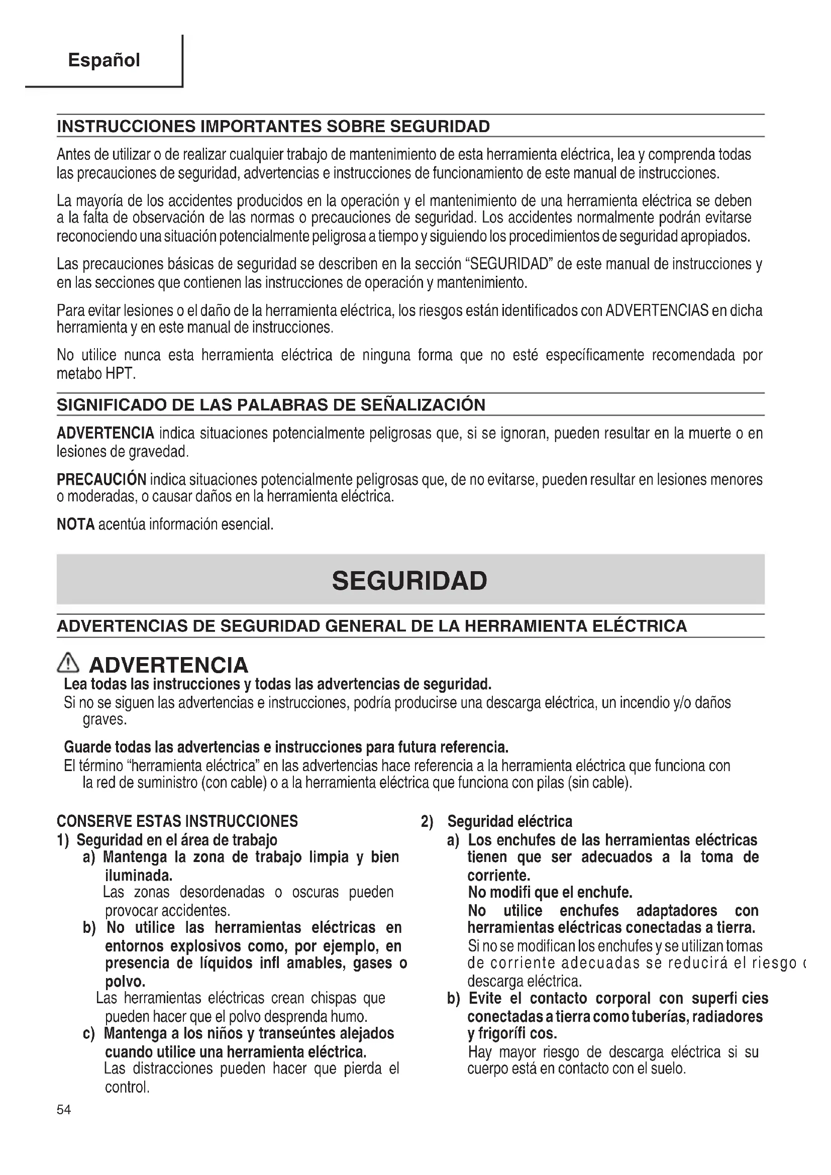 Antes de utilizar o de realizar cualquier trabajo de mantenimiento de esta herramienta eléctrica, lea y comprenda todas las precauciones de seguridad, advertencias e instrucciones de funcionamiento de este manual de instrucciones. La mayoría de los accidentes producidos en la operación y el mantenimiento de una herramienta eléctrica se deben a la falta de observación de las normas o precauciones de seguridad. Los accidentes normalmente podrán evitarse reconociendo una situación potencialmente peligrosa a tiempo y siguiendo los procedimientos de seguridad apropiados. Las precauciones básicas de seguridad se describen en la sección “SEGURIDAD” de este manual de instrucciones y en las secciones que contienen las instrucciones de operación y mantenimiento. Para evitar lesiones o el daño de la herramienta eléctrica, los riesgos están identifi cados con ADVERTENCIAS en dicha herramienta y en este manual de instrucciones. No utilice nunca esta herramienta eléctrica de ninguna forma que no esté específi camente recomendada por metabo HPT. SIGNIFICADO DE LAS PALABRAS DE SEÑALIZACIÓN ADVERTENCIA indica situaciones potencialmente peligrosas que, si se ignoran, pueden resultar en la muerte o en lesiones de gravedad. PRECAUCIÓN indica situaciones potencialmente peligrosas que, de no evitarse, pueden resultar en lesiones menores o moderadas, o causar daños en la herramienta eléctrica. NOTA acentúa información esencial. SEGURIDAD ADVERTENCIAS DE SEGURIDAD GENERAL DE LA HERRAMIENTA ELÉCTRICA ADVERTENCIA Lea todas las instrucciones y todas las advertencias de seguridad. Si no se siguen las advertencias e instrucciones, podría producirse una descarga eléctrica, un incendio y/o daños graves. Guarde todas las advertencias e instrucciones para futura referencia. El término “herramienta eléctrica” en las advertencias hace referencia a la herramienta eléctrica que funciona con la red de suministro (con cable) o a la herramienta eléctrica que funciona con pilas (sin cable).