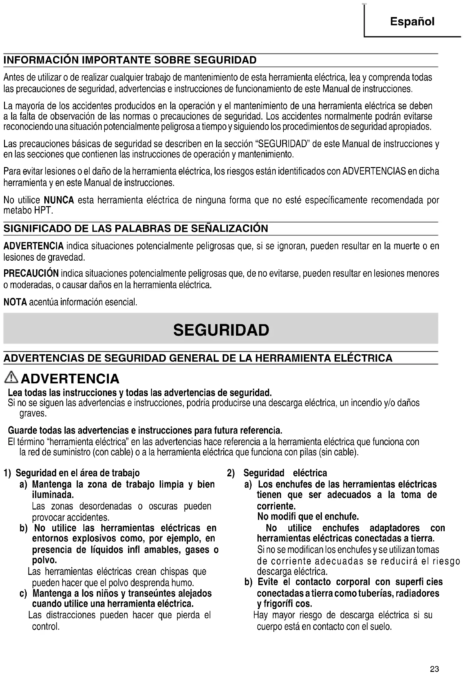 Français 0000GM13Ymetabo.indb220000GM13Ymetabo.indb22 2021/02/1812:38:042021/02/1812:38:04INFORMACIÓN IMPORTANTE SOBRE SEGURIDAD Antes de utilizar o de realizar cualquier trabajo de mantenimiento de esta herramienta eléctrica, lea y comprenda todas las precauciones de seguridad, advertencias e instrucciones de funcionamiento de este Manual de instrucciones. La mayoría de los accidentes producidos en la operación y el mantenimiento de una herramienta eléctrica se deben a la falta de observación de las normas o precauciones de seguridad. Los accidentes normalmente podrán evitarse reconociendo una situación potencialmente peligrosa a tiempo y siguiendo los procedimientos de seguridad apropiados. Las precauciones básicas de seguridad se describen en la sección “SEGURIDAD” de este Manual de instrucciones y en las secciones que contienen las instrucciones de operación y mantenimiento. Para evitar lesiones o el daño de la herramienta eléctrica, los riesgos están identifi cados con ADVERTENCIAS en dicha herramienta y en este Manual de instrucciones. No utilice NUNCA esta herramienta eléctrica de ninguna forma que no esté específi camente recomendada por metabo HPT. SIGNIFICADO DE LAS PALABRAS DE SEÑALIZACIÓN ADVERTENCIA indica situaciones potencialmente peligrosas que, si se ignoran, pueden resultar en la muerte o en lesiones de gravedad. PRECAUCIÓN indica situaciones potencialmente peligrosas que, de no evitarse, pueden resultar en lesiones menores o moderadas, o causar daños en la herramienta eléctrica. NOTA acentúa información esencial. SEGURIDAD ADVERTENCIAS DE SEGURIDAD GENERAL DE LA HERRAMIENTA ELÉCTRICA ADVERTENCIA Lea todas las instrucciones y todas las advertencias de seguridad. Si no se siguen las advertencias e instrucciones, podría producirse una descarga eléctrica, un incendio y/o daños graves. Guarde todas las advertencias e instrucciones para futura referencia. El término “herramienta eléctrica” en las advertencias hace referencia a la herramienta eléctrica que funciona con la red de suministro (con cable) o a la herramienta eléctrica que funciona con pilas (sin cable).